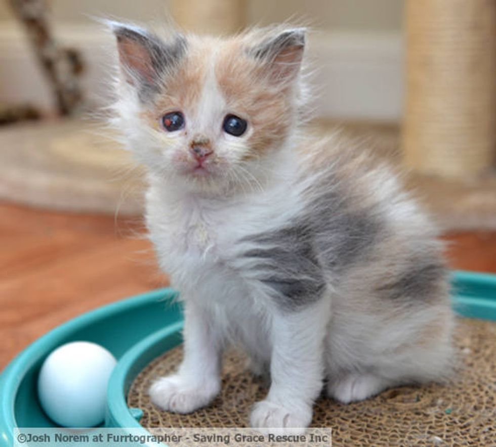 Tiny Schmoo came to Saving Grace Rescue Inc unable to see due to an eye infection, but the little calico is now healing and beginning to see more.