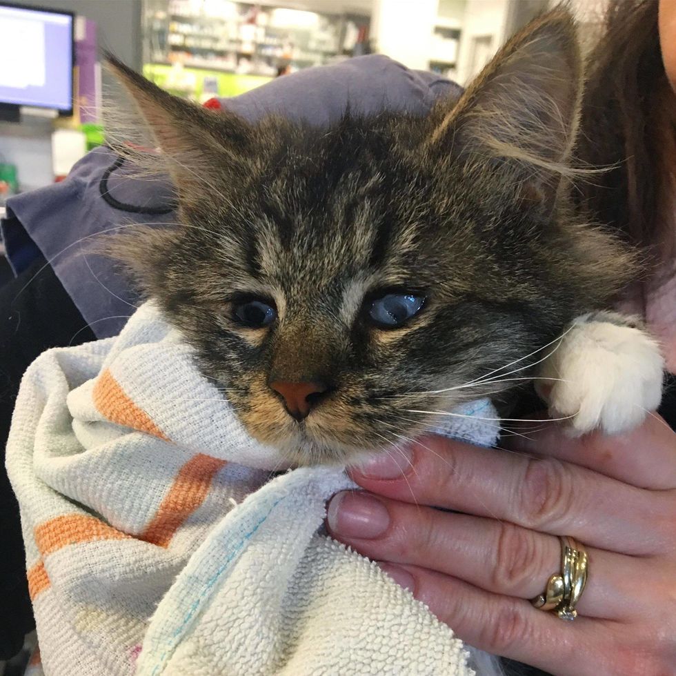 A kitten was found alone on the streets with severely infected eyes. He was in terrible shape, just skin and bones and couldn't see.