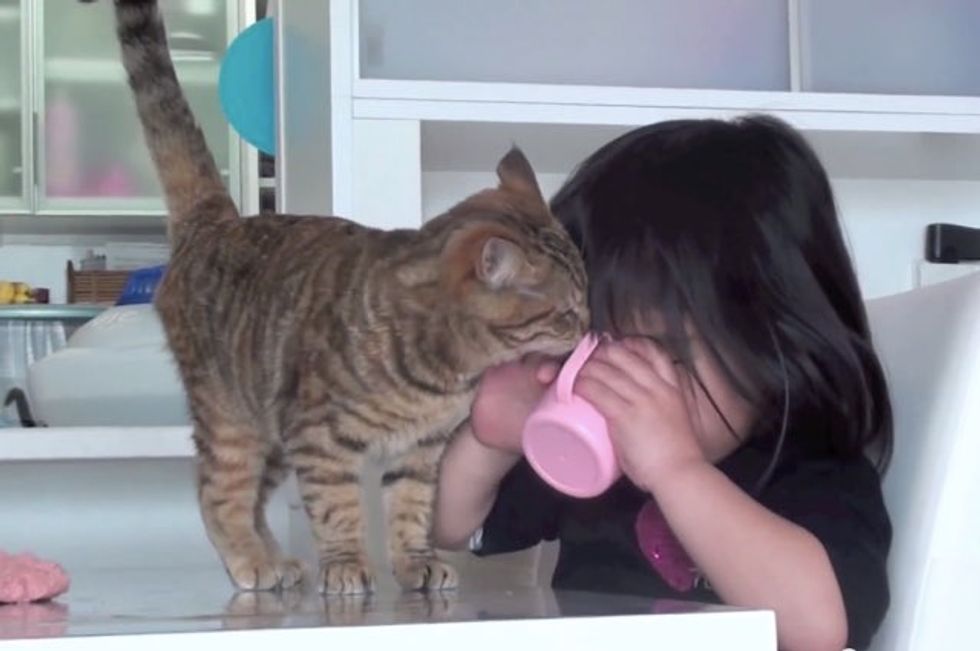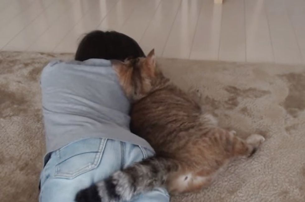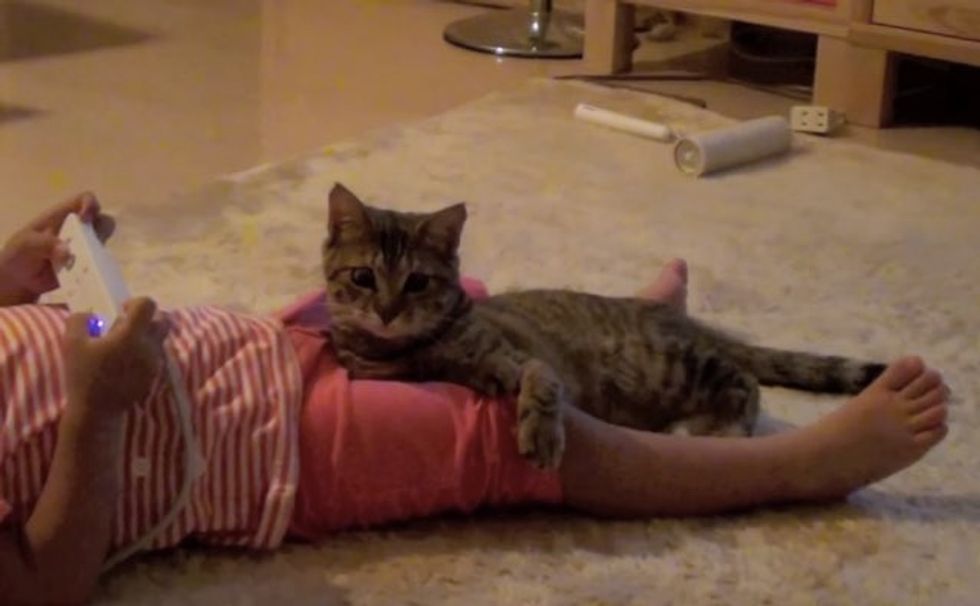 When their daughter plays video games, Teto snuggles up to her as her leg warmer.