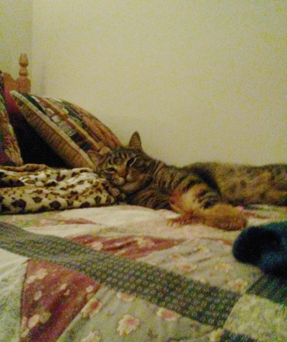 Two days after their arrival at their new abode, Midnight and Clarence have already taken over their human's bed.
