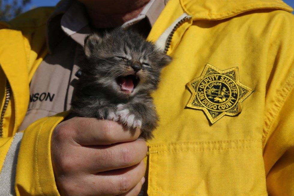 According San Diego Sheriff, the kittens were saved from the rubble. "Deputies patrolling burned areas of Bonsall found a box of kittens and turned them over to County Animal Services for some TLC."