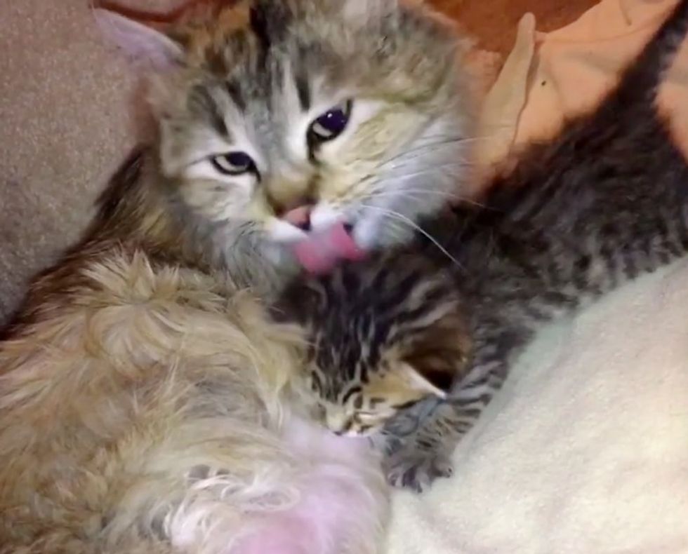 They introduced Ariel to Twilight the cat mom, hoping the kitten would latch on and start nursing. Mama Twilight took to her right away and began grooming her as her own, but Ariel kept squirming away and was not able to nurse.