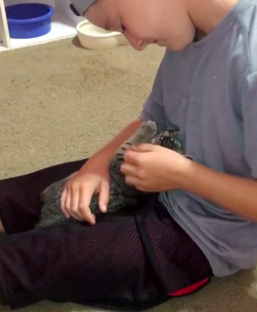 No one was able to calm her down, so Zack put the kitten in his arms and started talking to her softly while giving her kisses and pets. Eventually little Ariel fell asleep in his lap. (Scroll down for video)