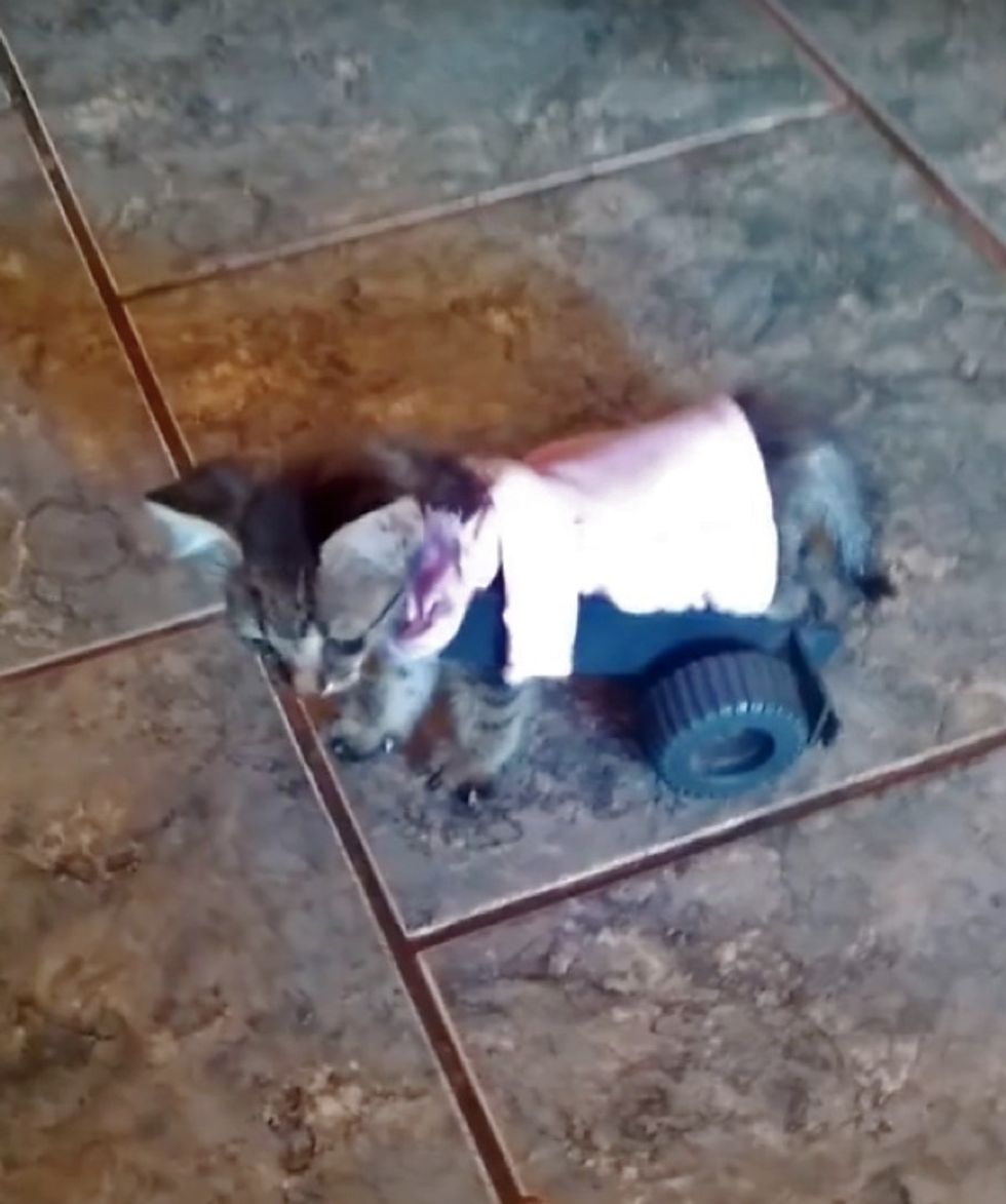 Once the contraption was complete, he brought it to the kitten to try on. "She started walking in a few minutes. The idea was great and she walked in it on her first try."