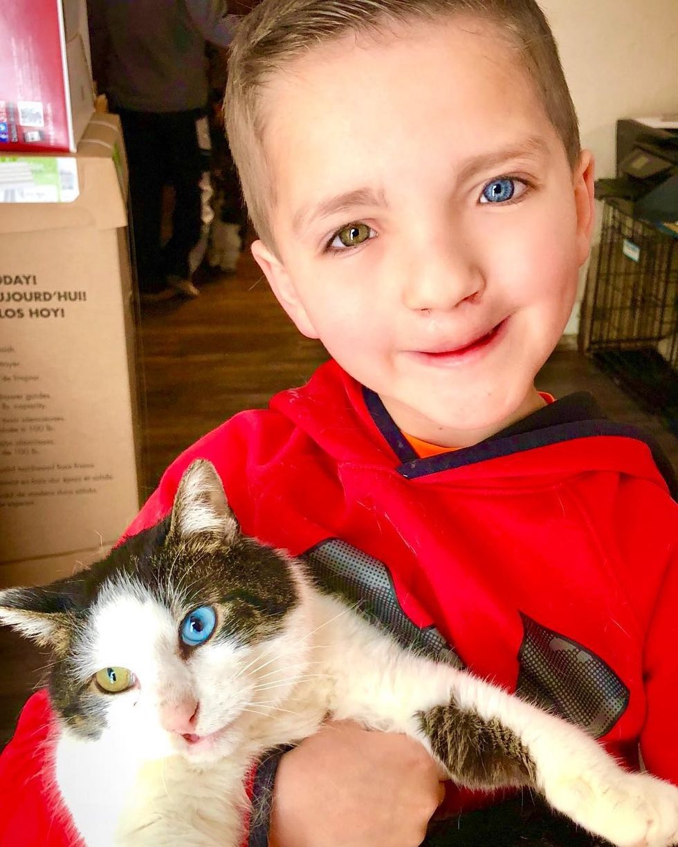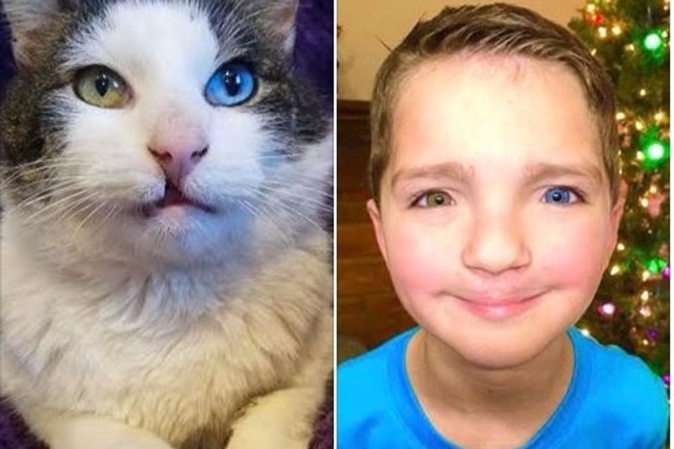 An odd-eyed cat found his perfect friend, a boy named Madden. They were both born with different colored eyes and cleft lips.