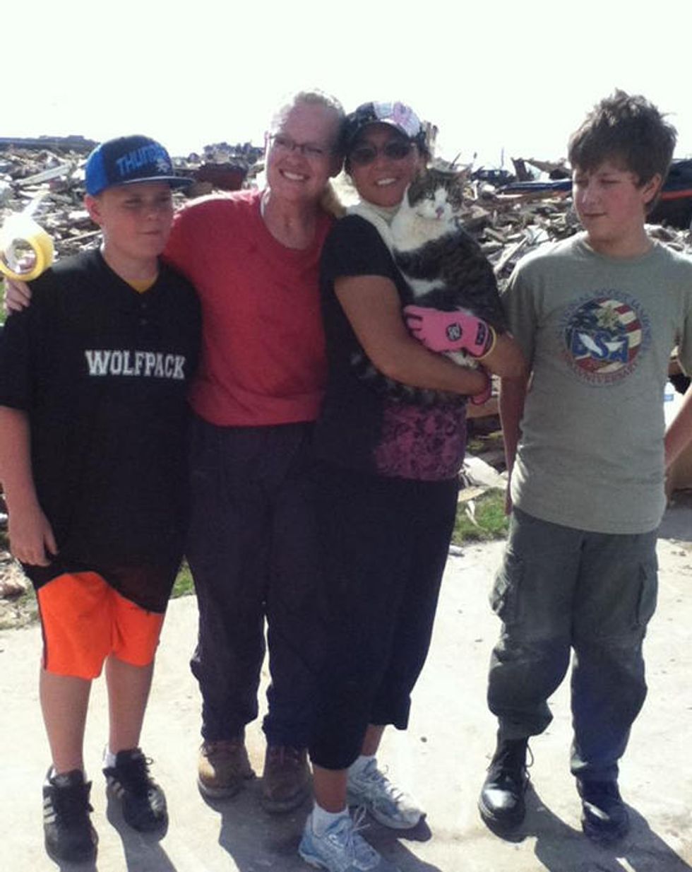 Justin Hulmerangel helped pass out donated items and helped with the search and clean up efforts. While he was searching in the rubble of Jo Humann's home, he came across a cat in a litter box under a table.