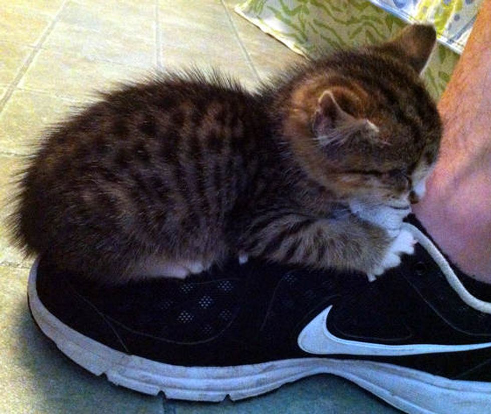 Braille the cat was born without eyes. This is her napping on her human's foot when they first got her.