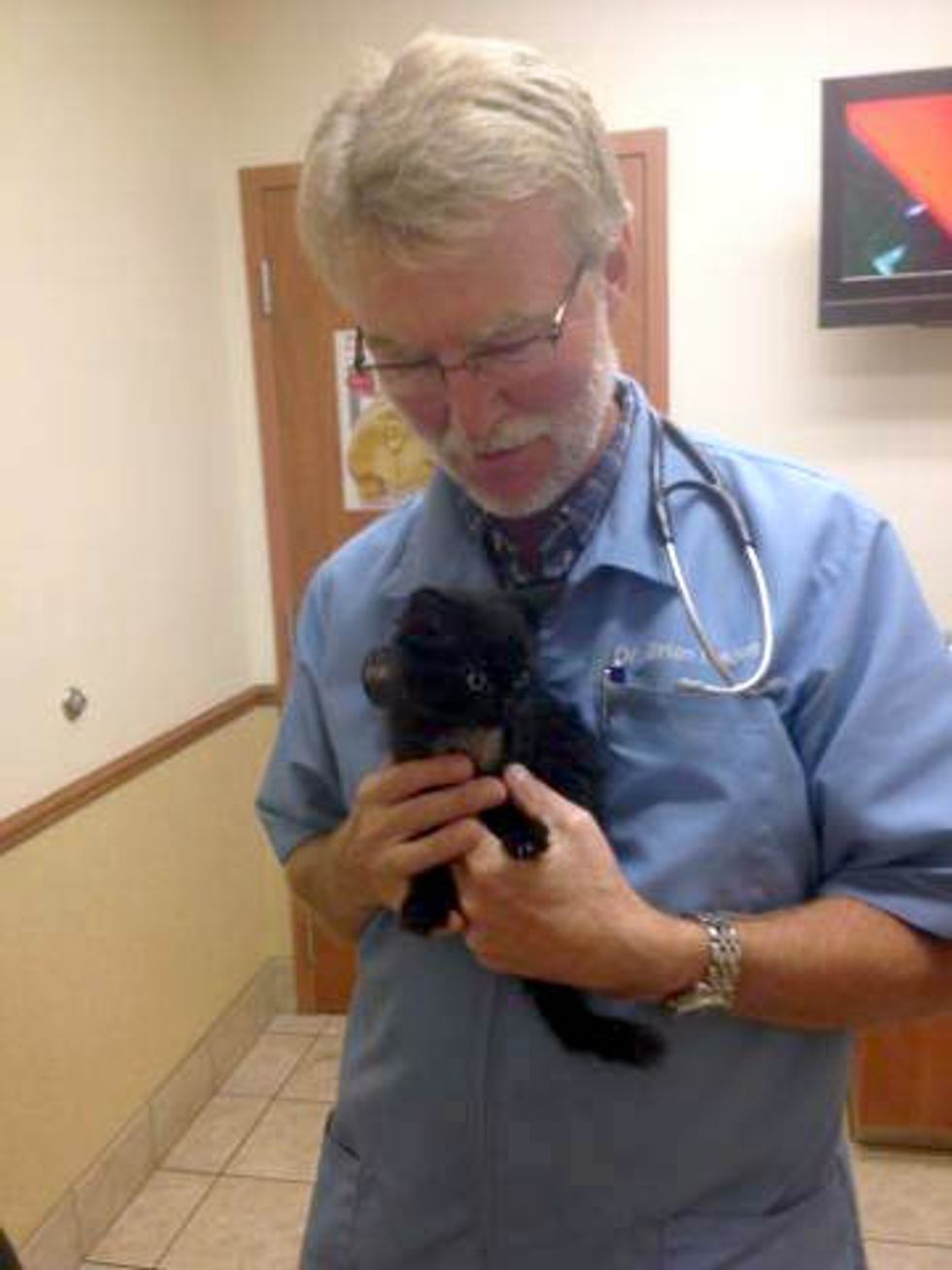 "He was found in the street at four weeks old, dragging his limp front leg behind him." In order to save his life, the vet decided to remove his injured leg.