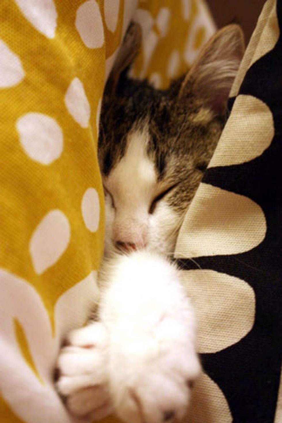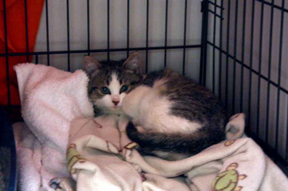 "In the morning when I woke up to walk my dog Budda, I figure I'd made an attempt to get her out of the crate. I took apart the crate like the vets showed us once, so the top was off and she dashed towards the back of the cage and hissed at me. The next day the hissing had calmed down. Debra got out the baby food left by (a foster parent) Kim and fed her on a spoon and with a big wooden spoon she pet the kitten, and while I took Budda out for his evening walking, Debra managed not only to pet her, but give her a belly rub and carry her and put her in her lap for a pet. Amazing!"