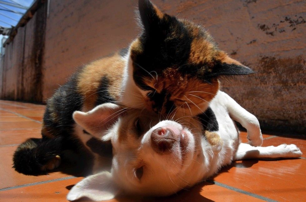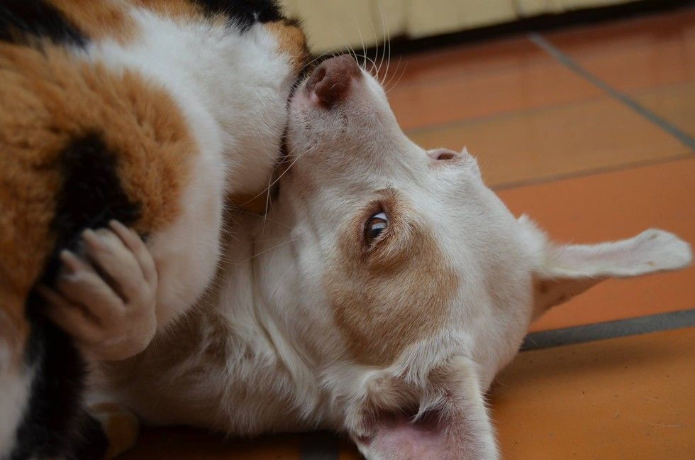 Berenice the calico cat adores her sister Lucy the dog and gives her all the cuddles she could possibly supply. Lucy doesn't mind the affection at all, and she returns the same love to her best feline friend.