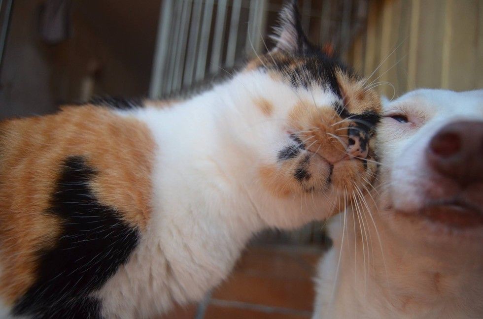 A calico cat is so smitten with her canine sister that she smothers her with snuggles and headbumps. There's no shortage of love in the house when the two buddies are together.