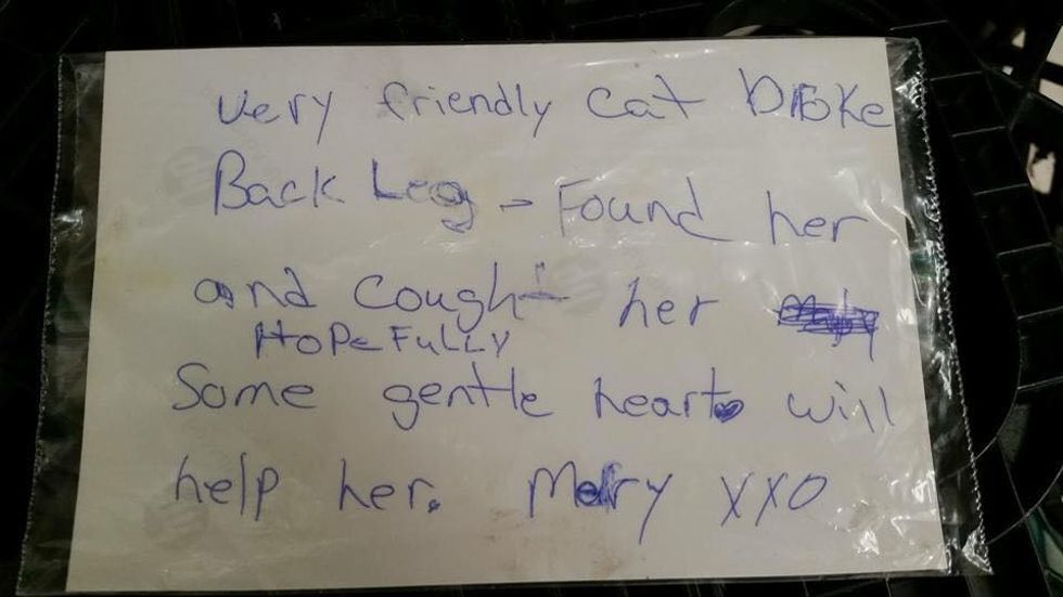 The note says: "Very friendly cat broke back leg - found her and caught her. Hopefully some gentle heart will help her."