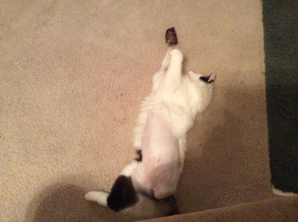 "Miss Mia got up and attempted to walk. She, like any other amputee of her age stumbled, but made it to her destination. She came to me, she took her head and bonked my chin, she looked at me with the eyes of thankfulness and she purred so very loud."