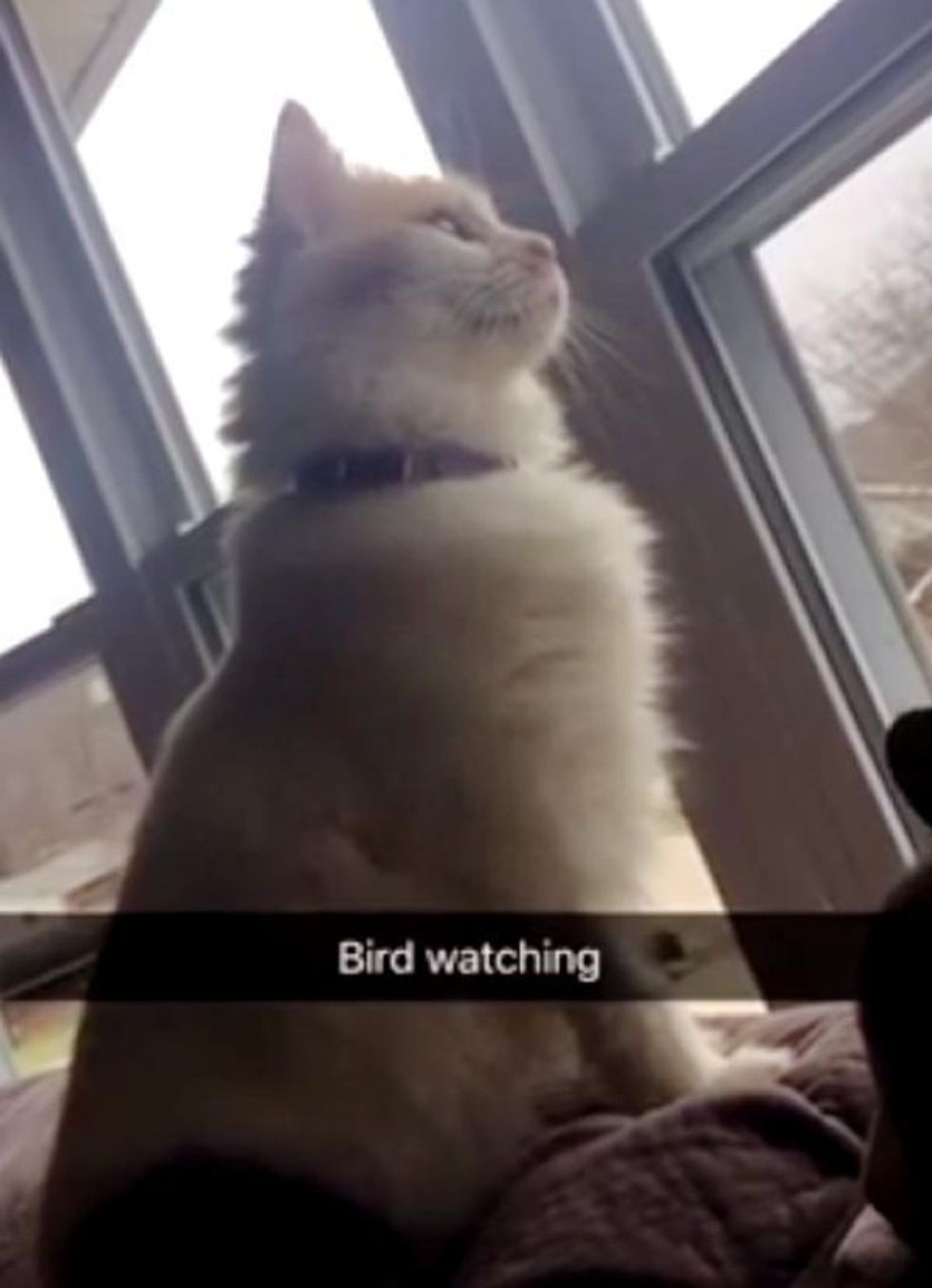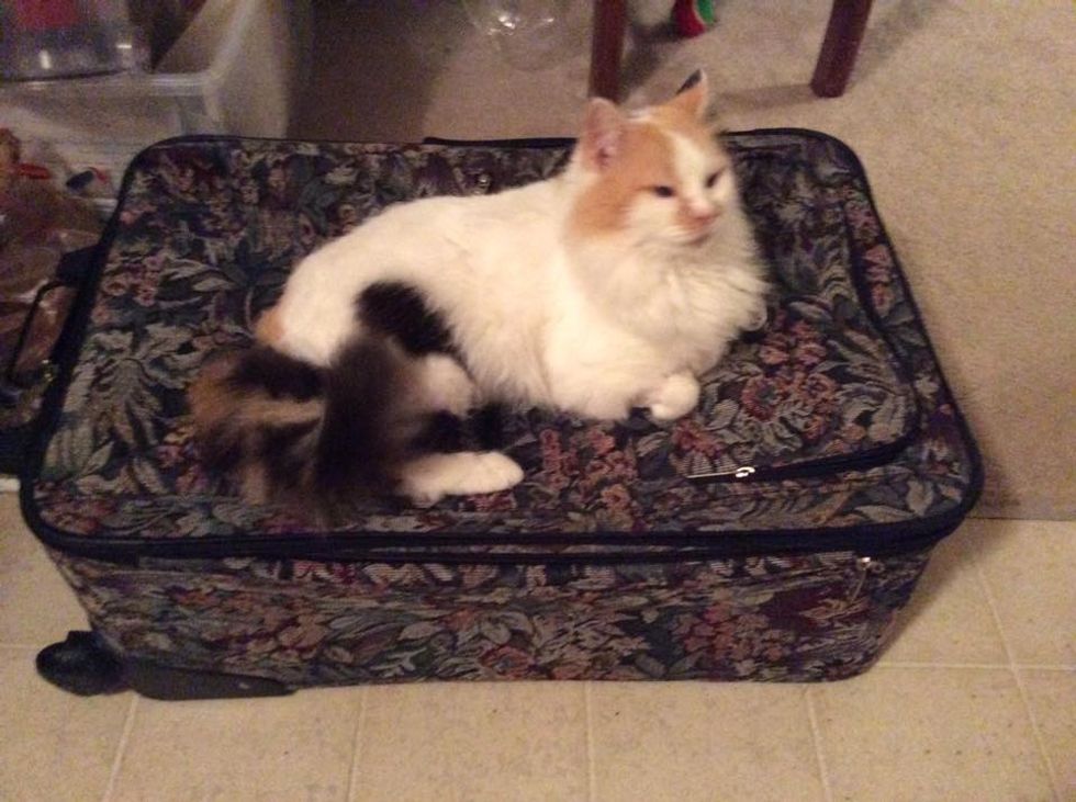 Miss Mia Noel helps her foster mom pack by sitting on it.