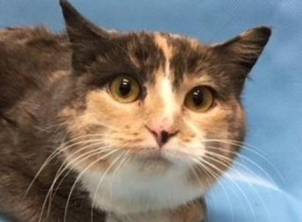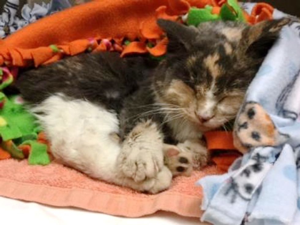A calico cat was found "frozen to the ground" and saved in the nick of time. A month later, she was ready to find her forever loving home on this Valentine's Day.