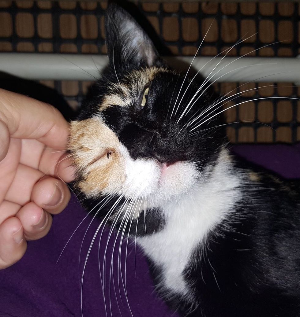 Holly purring at her caregiver, showing her love. "Even though someone did this to her, look at all the love she has to offer."