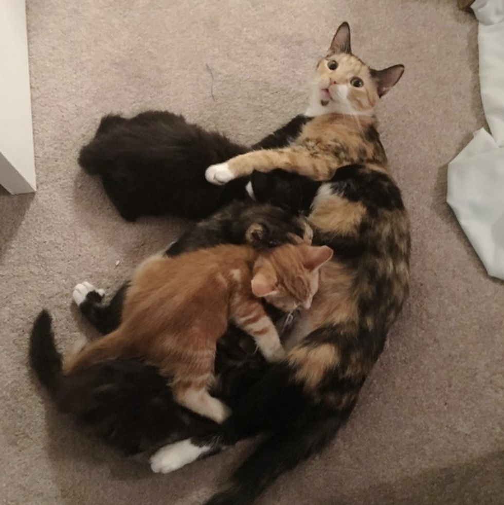 She's purring up a storm while her babies are nursing away.