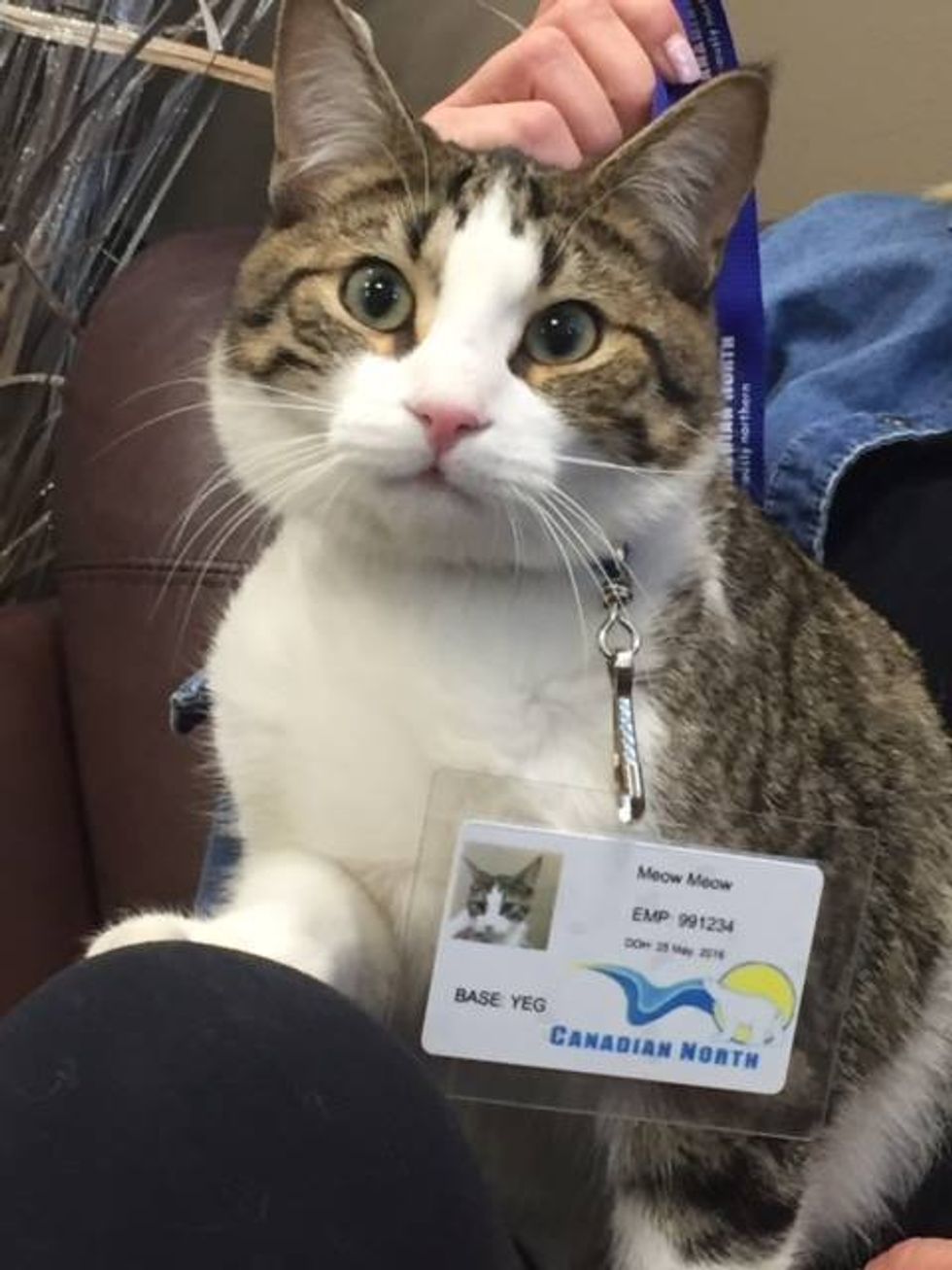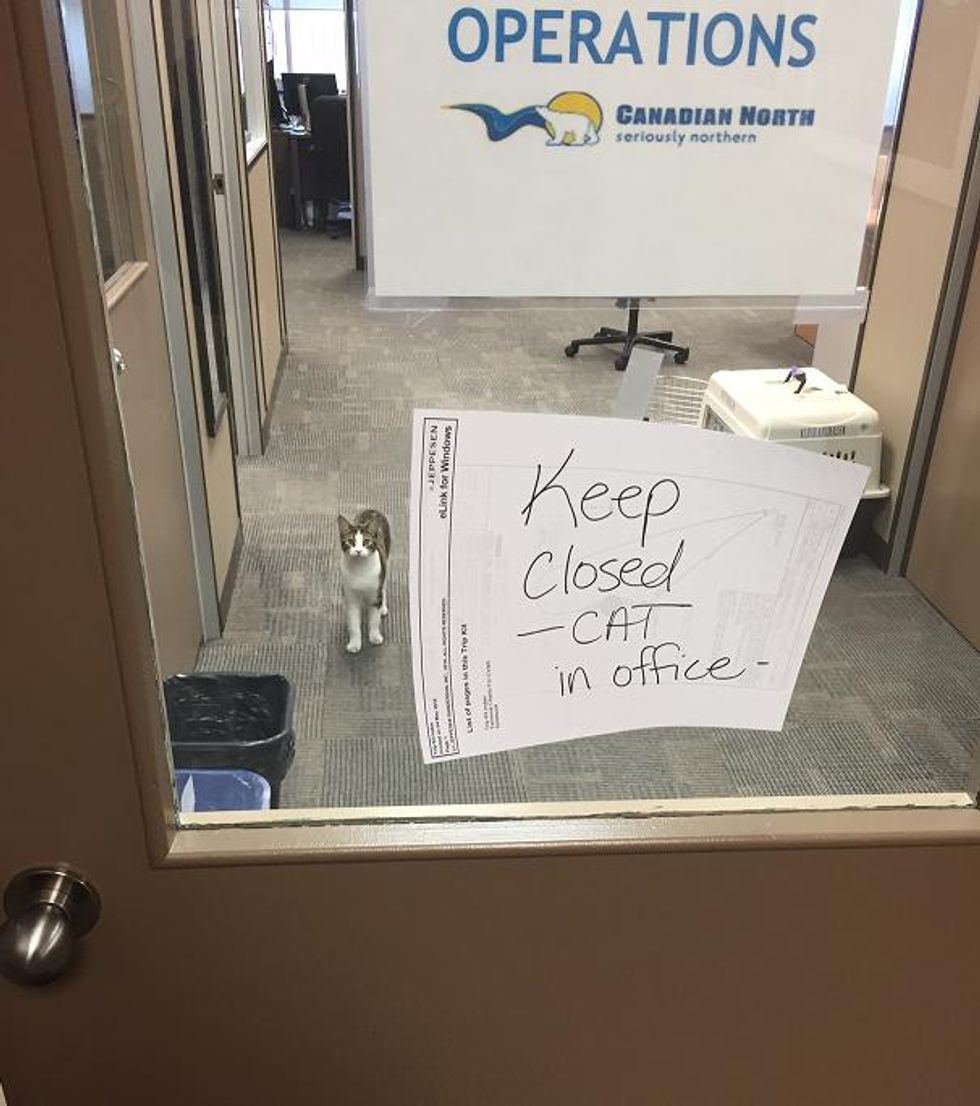 "One of our passengers has now gone into labour, so our Flight Operations team is kitty-sitting her cat 'Meow Meow' in our offices. They are very busy with the many extra flights Canadian North is operating, but it's certainly nice to have Meow Meow around to keep them company while they work!"