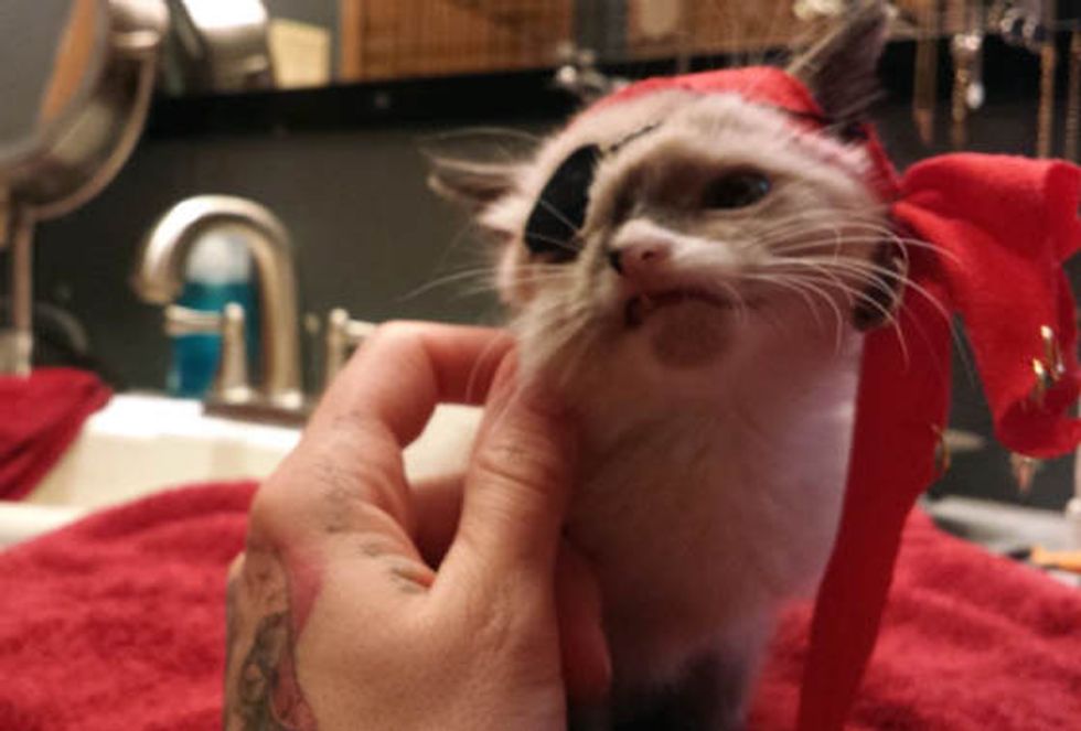 When he was turned into Multnomah County Animal Services, they discovered that he had calicivirus, a severe flea infestation, a heart murmur, a missing eye and a possible jaw fracture that has since healed. He was left with a smile resembling a pirate - a cute pirate that he is.