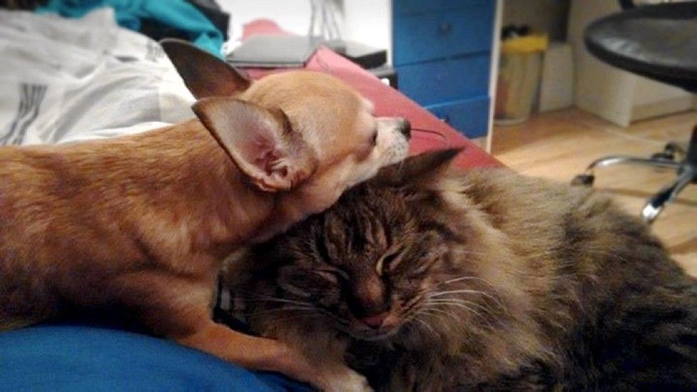 A fluffy Norwegian Forest cat went missing for five days and when he found his way home, his best friend, a Chihuahua, ran up to him to offer cuddles and love.