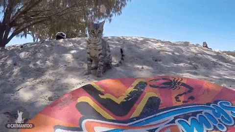 While Boomer is skimboarding, Didga (the cat) is cheering him on!