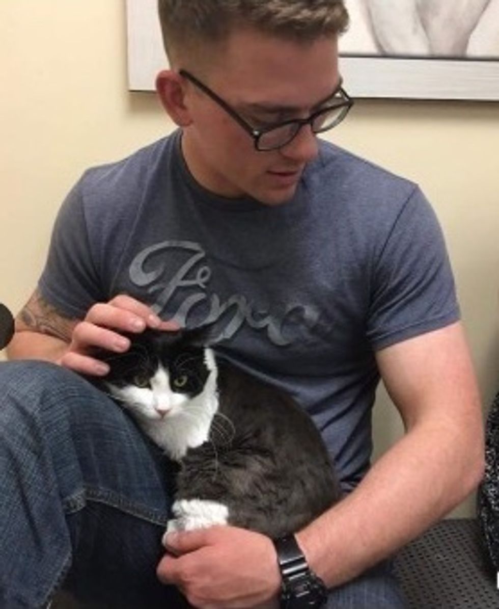 A cat who was abandoned by his former home, clung to a man at the shelter and wouldn't let go.