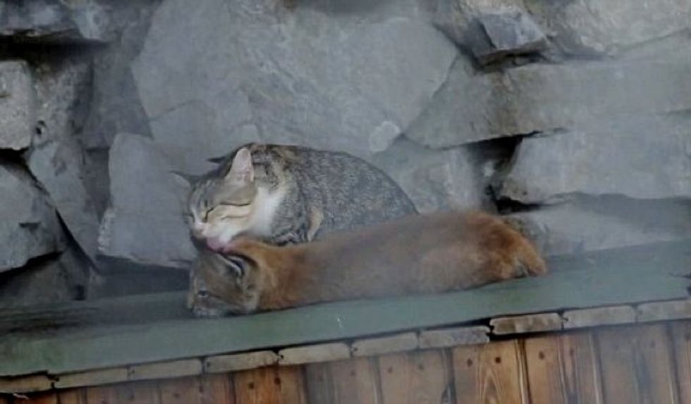 They were hoping that the cat who had given birth to kittens would adopt the little baby lynx as her own. Soon after they met, the domesticated cat’s motherly instinct kicked in and she started grooming her new baby.