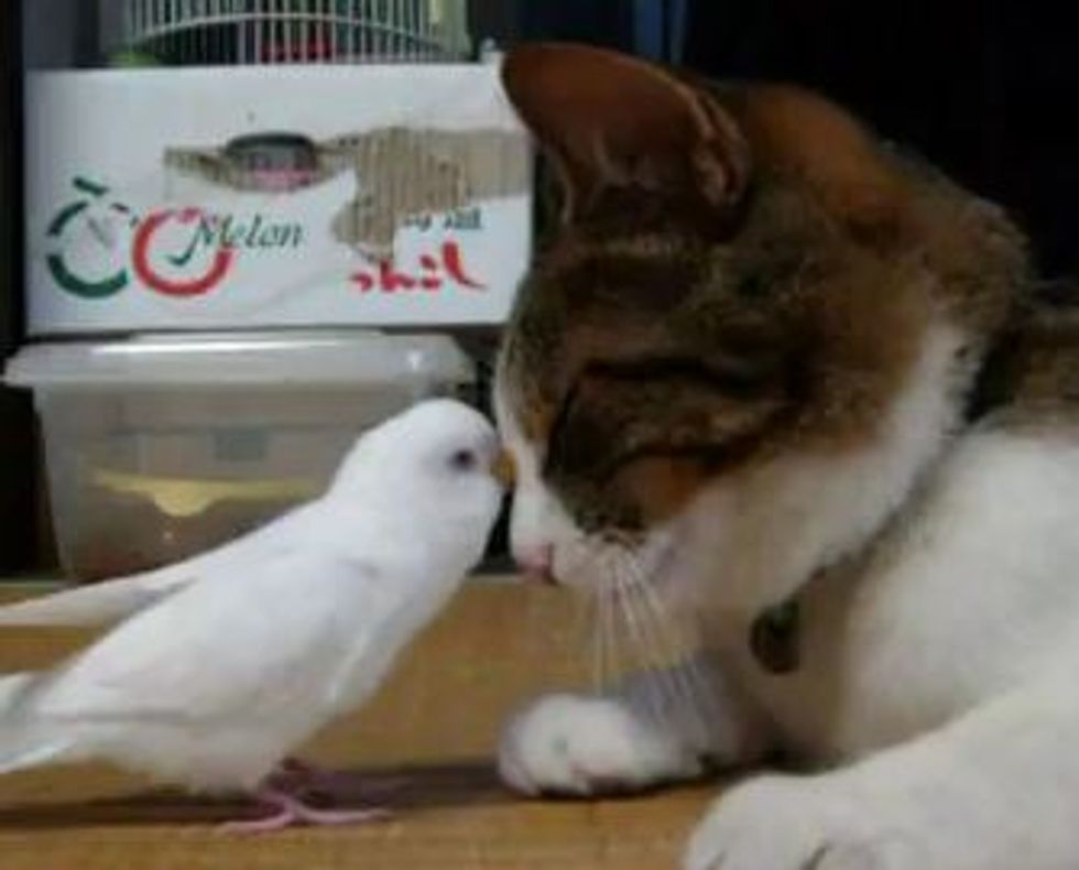 Who said cats and birds can't get along? These two little guys seem to have broken all the stereotypes about cats and birds. The little birdie loves his kitty friend and wants some play time, but the kitty is trying to chill.