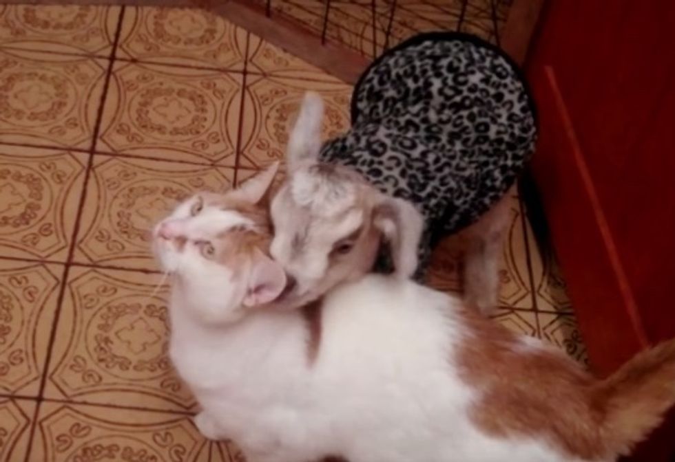 An orphaned baby goat was saved from a certain death by rescuers. He was in desperate need of love, and that's when a caring cat took to him and adopted him as his own.