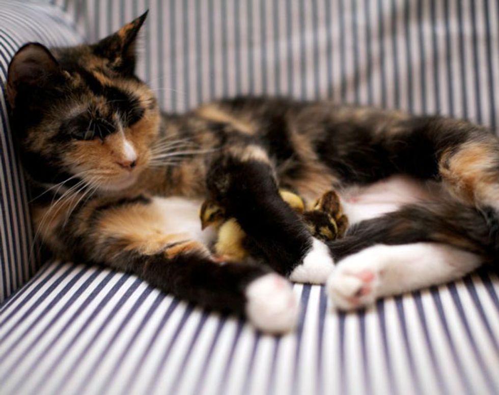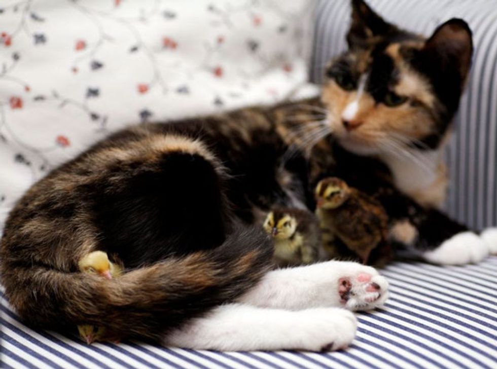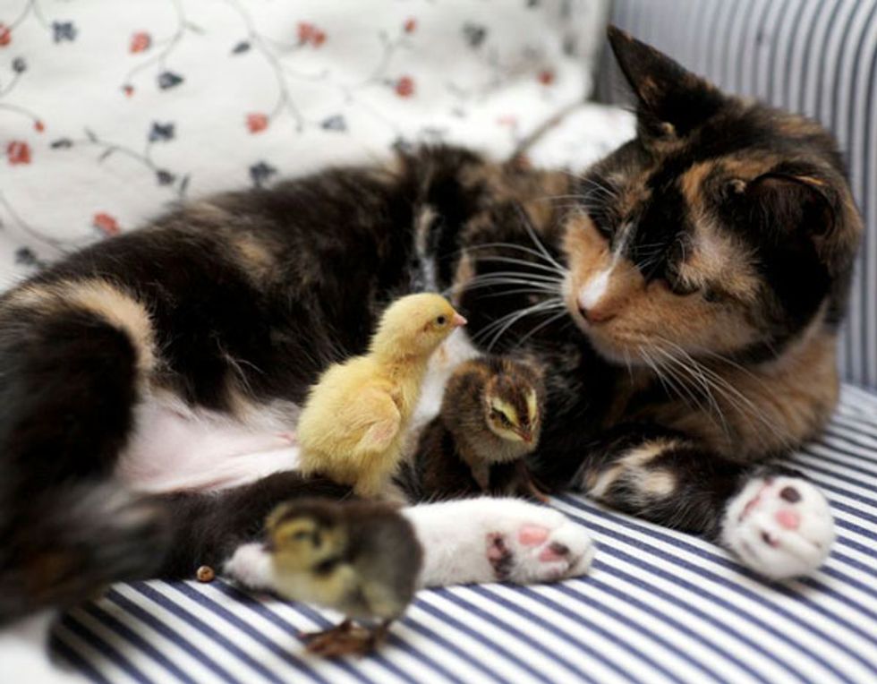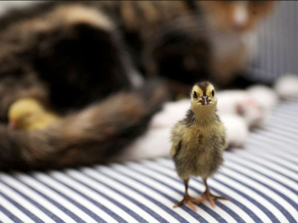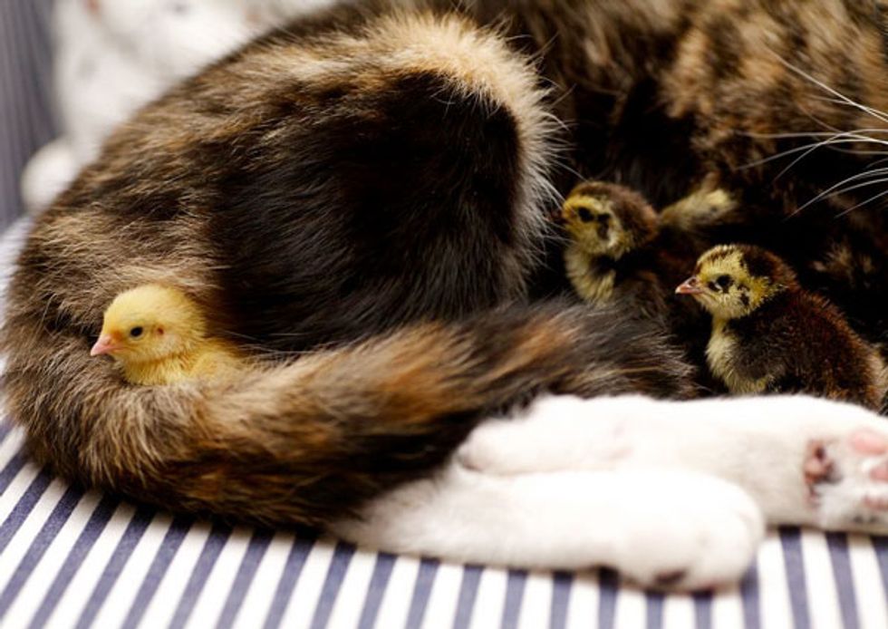 When Kris had their newly hatched quail chicks, her calico cat Nishi started snuggling with them like a mother with her new born kittens. "Our cat, Nishi, enjoys snuggling, and baby quail need to be kept warm all the time. It’s a win-win situation. These chicks are about two days old. Nishi seems to think they’re her babies," said Kris C..