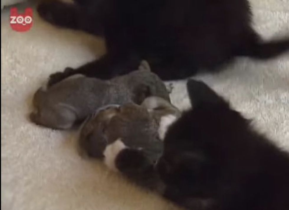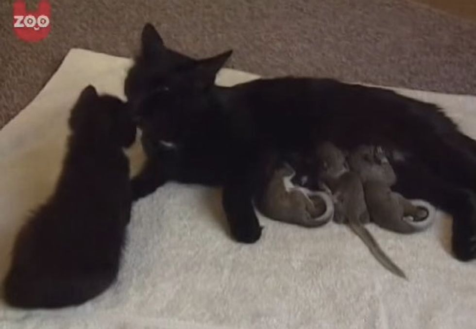 A mama cat adopted four three unusual babies that do not know how to meow, but needed a lot of motherly love.