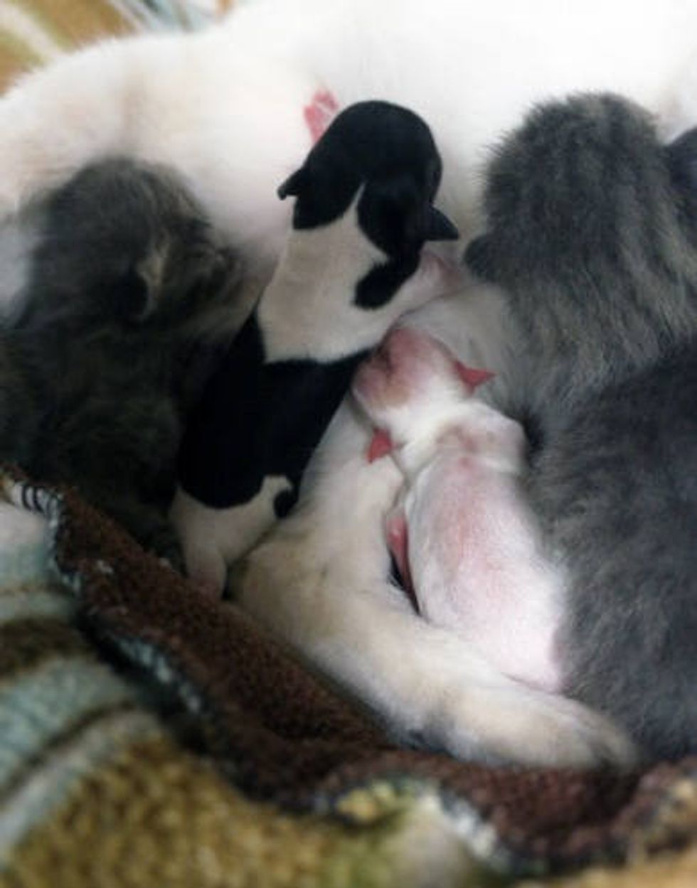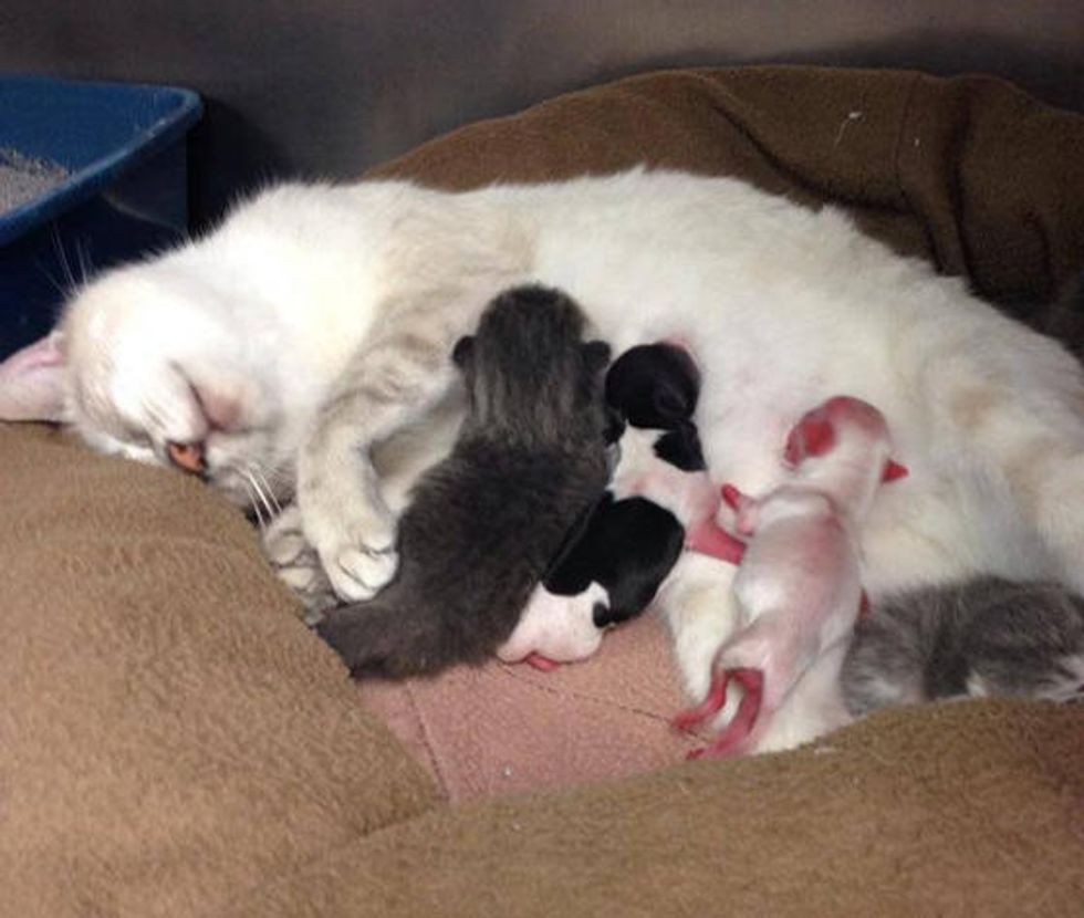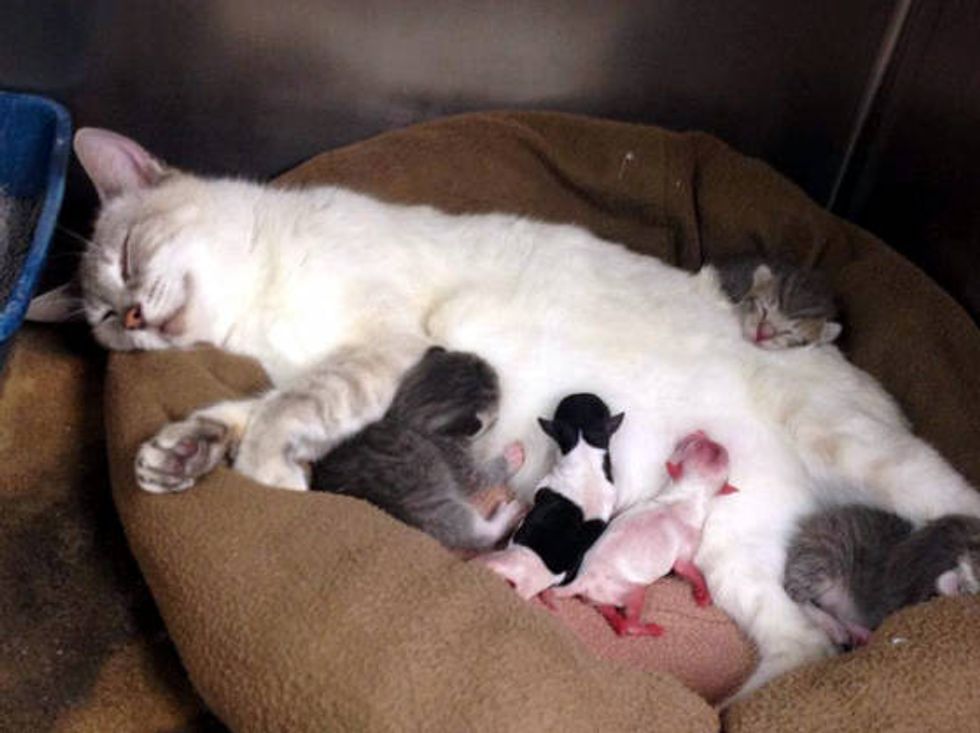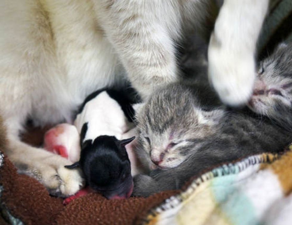 These preemie babies were rejected by their mother dog and were in desperate need of a mother’s care in order to survive. That’s when Nessie stepped in and saved their lives. She has been nursing the pups along with her own four kittens ever since.
