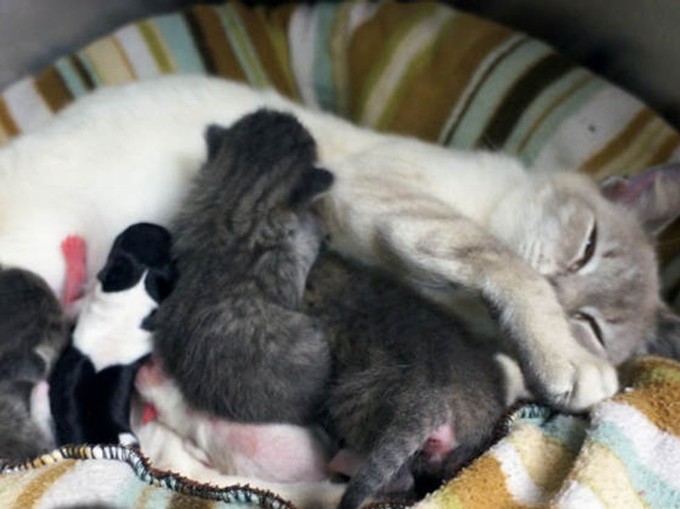 A Siamese mama cat, Nessie, took in 2 preemie puppies, nursing and caring for them like her own.