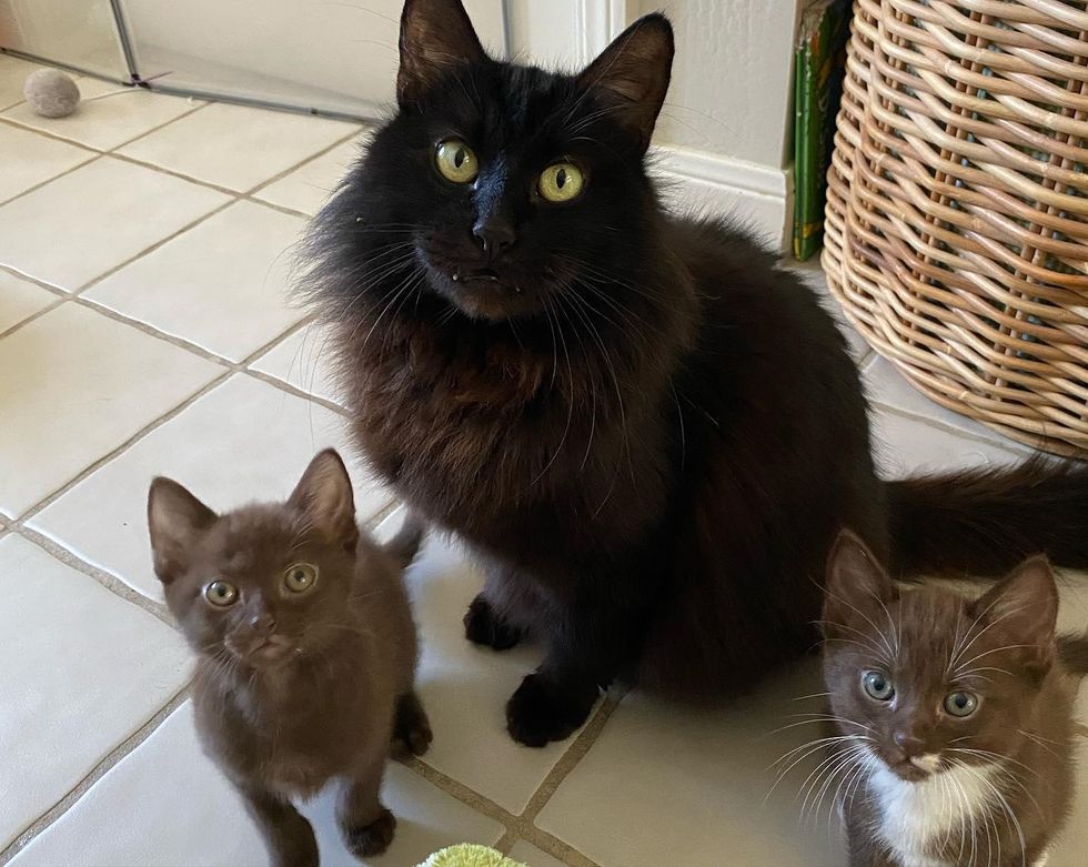All of her kittens wear a beautiful chocolate brown coat — a genetic mutation of the black color gene. "Brown cats do exist as a coloration, but they are pretty rare."