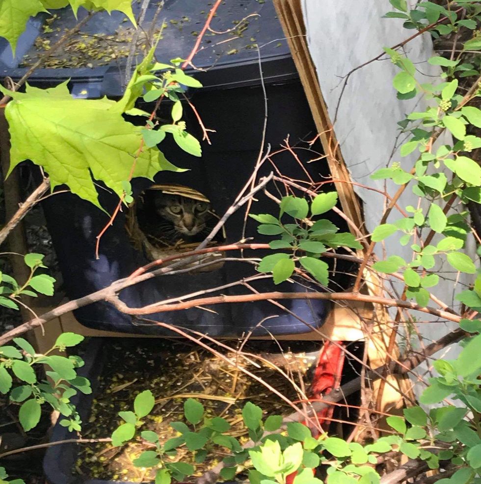 A Good Samaritan from Montreal, Canada spotted a stray cat entering an outdoor shelter made out of a large container, on the side of the road.