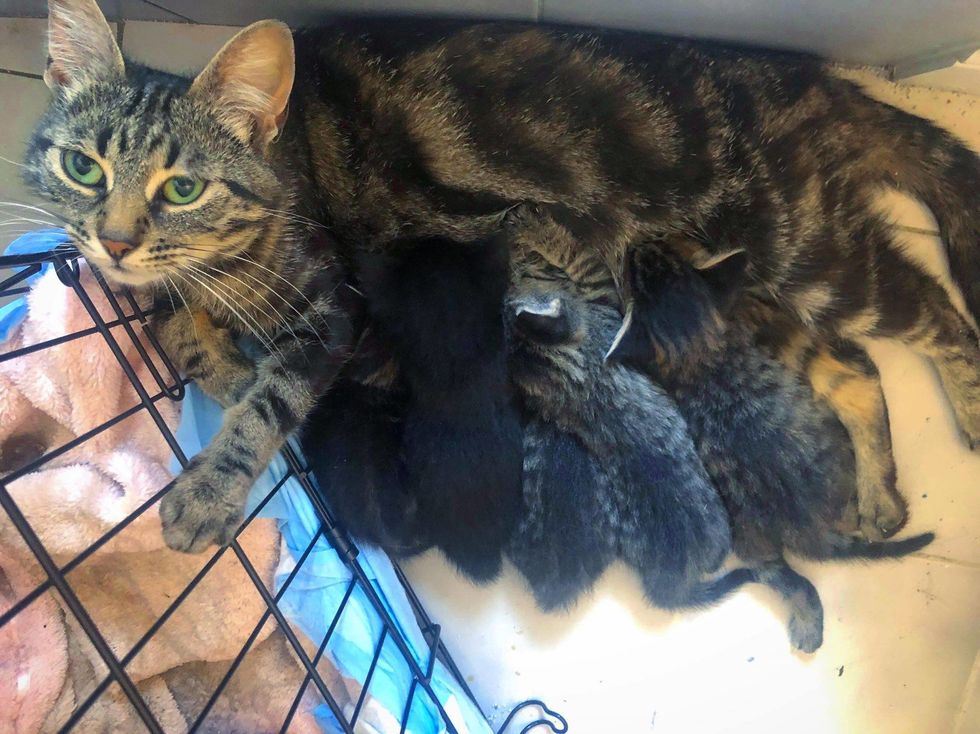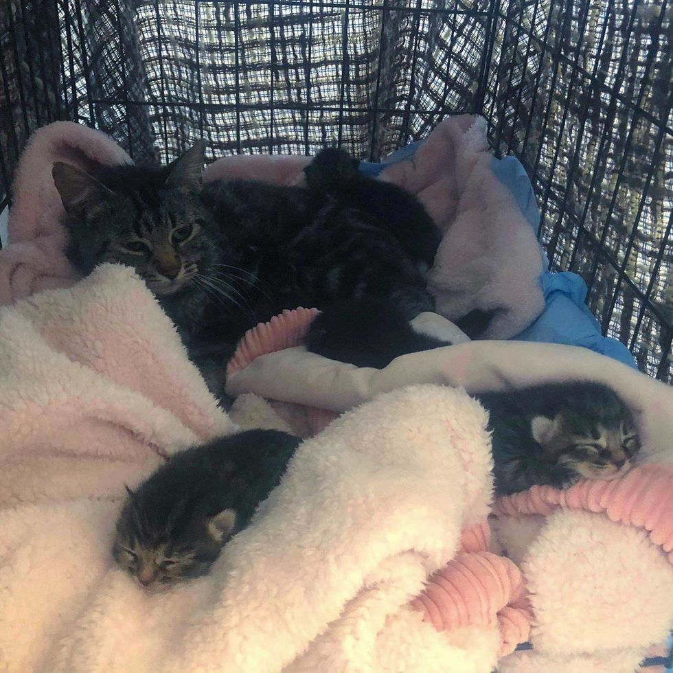 Once the cat mom was secured, she placed the five kittens in a carrier and took them all home.