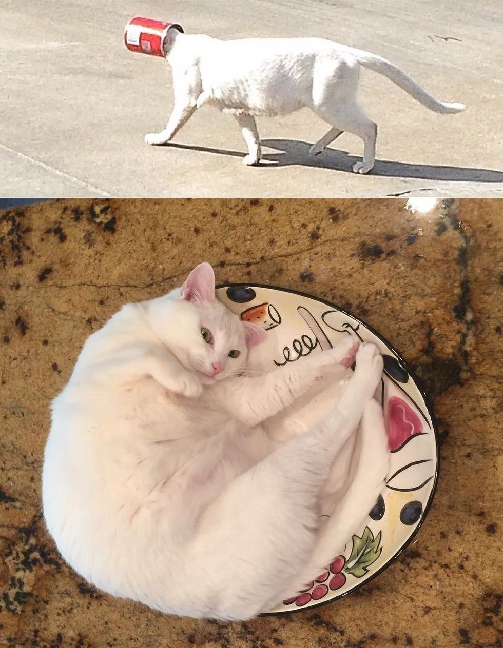 She was confused and meowing for help. A sales person from the dealership freed her from the can but the kitty quickly wandered off.