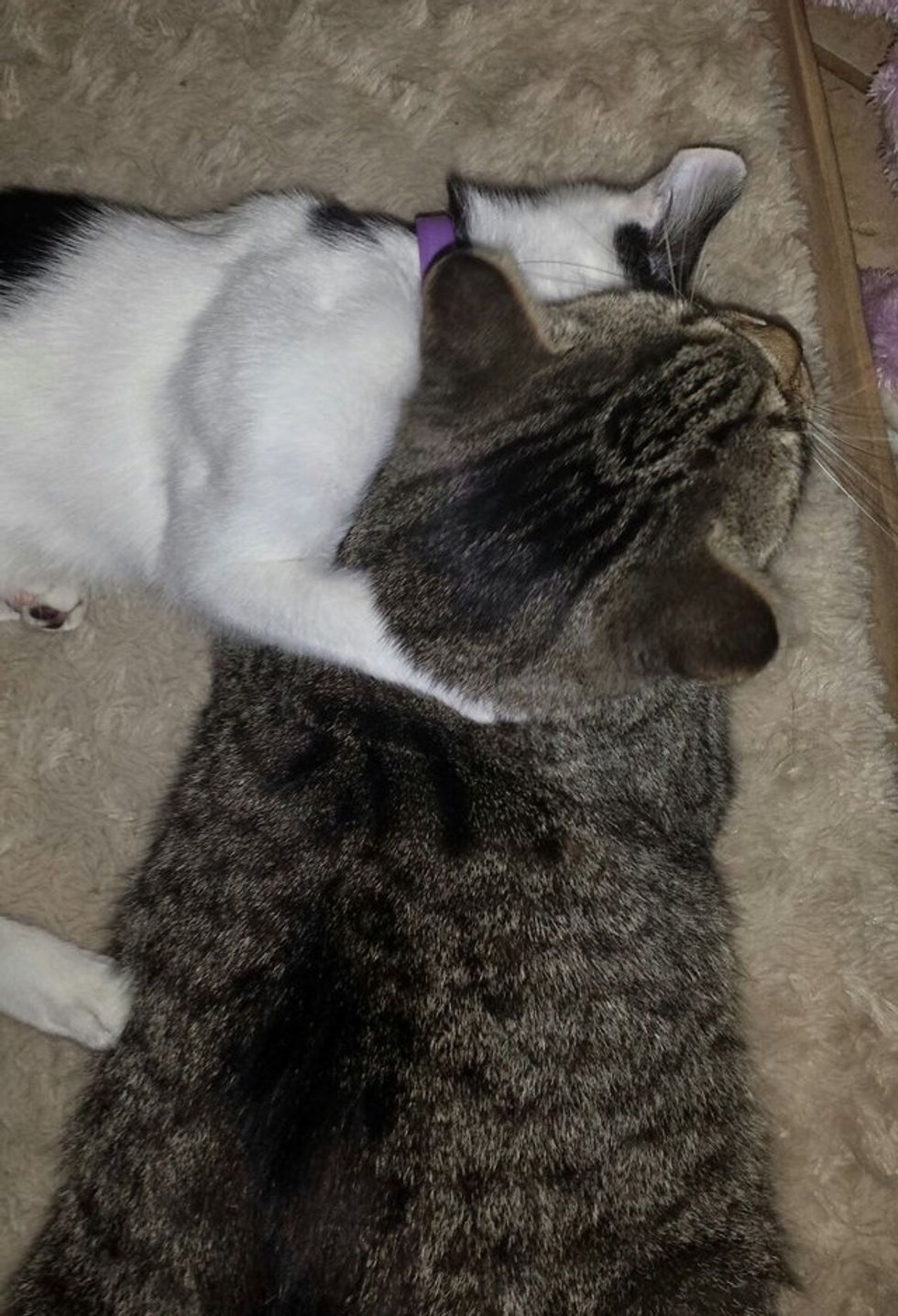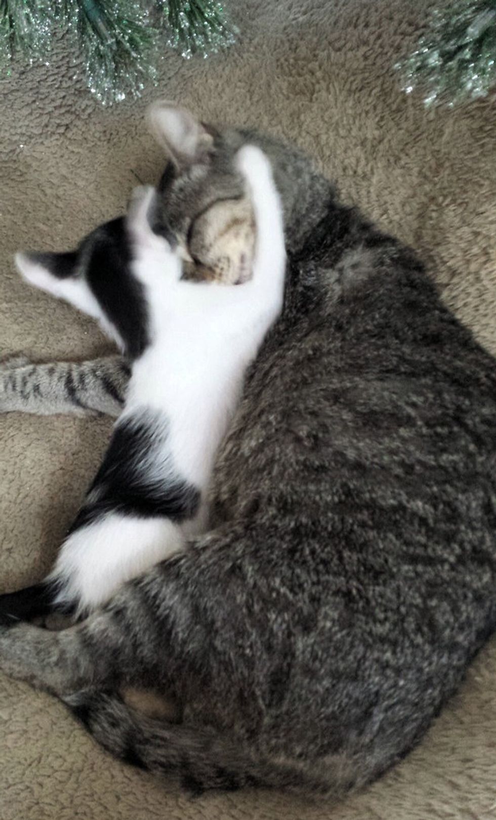 The tiny kitten reminded the tabby cat of her own babies. Posey went into full-on mother mode, caring and grooming the little 7-week-old kitten as her own.