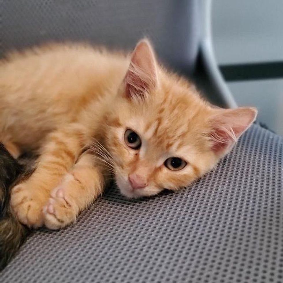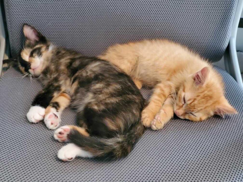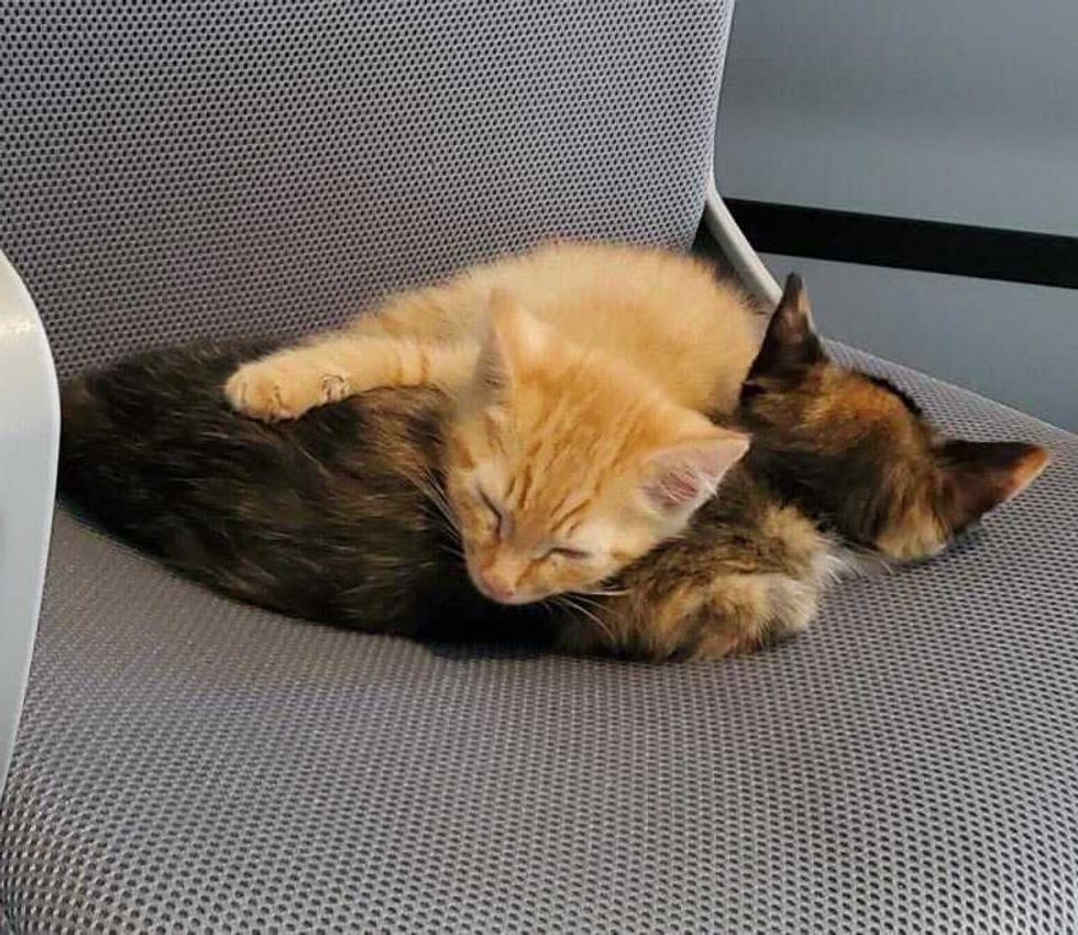 The cat mom has been named Mildred, and her kittens Charlotte (the calico sister) and Hank (the orange brother). They are all underweight and have a lot of growing and filling out to do.