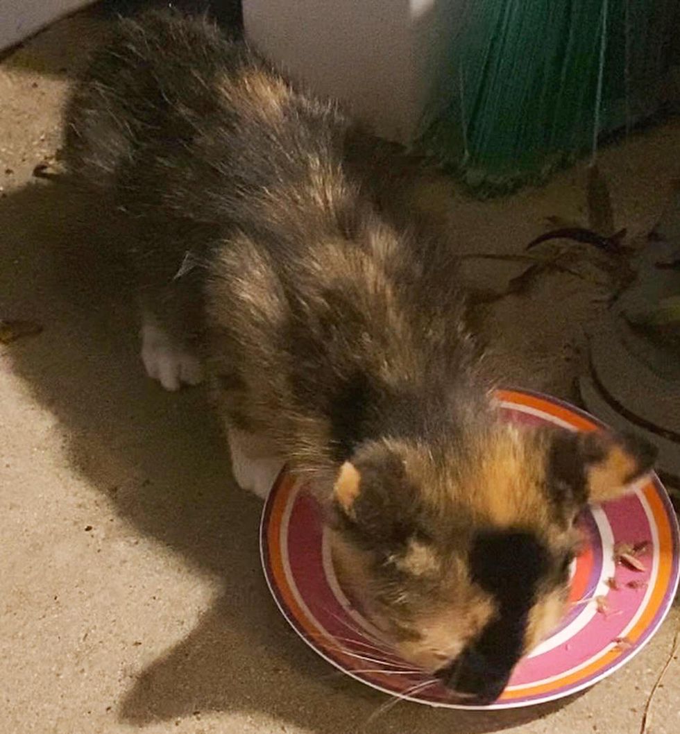 She brought a ginger kitten, a mini version of herself, along. The kitten trailed behind his mother and was eager for something to eat. The following night, the cat mom returned and surprised her human friend with not just one, but two little hungry mouths to feed.