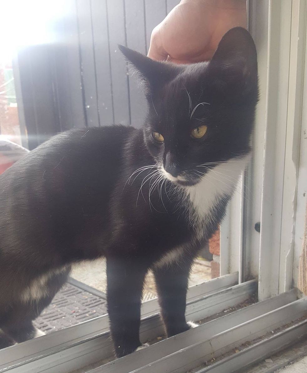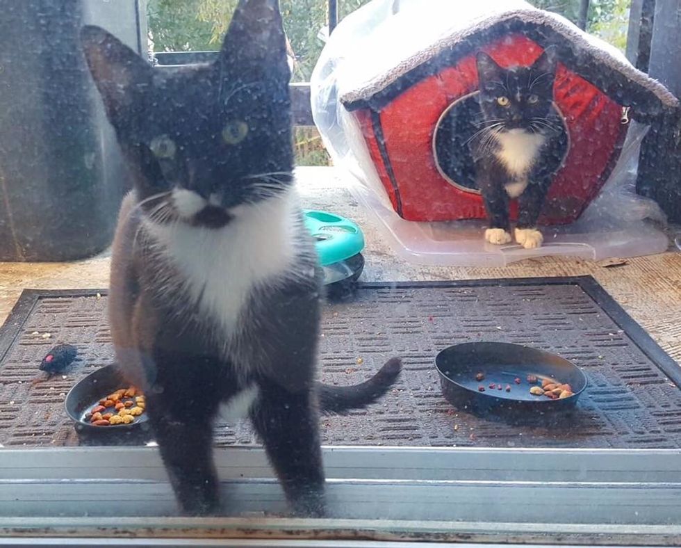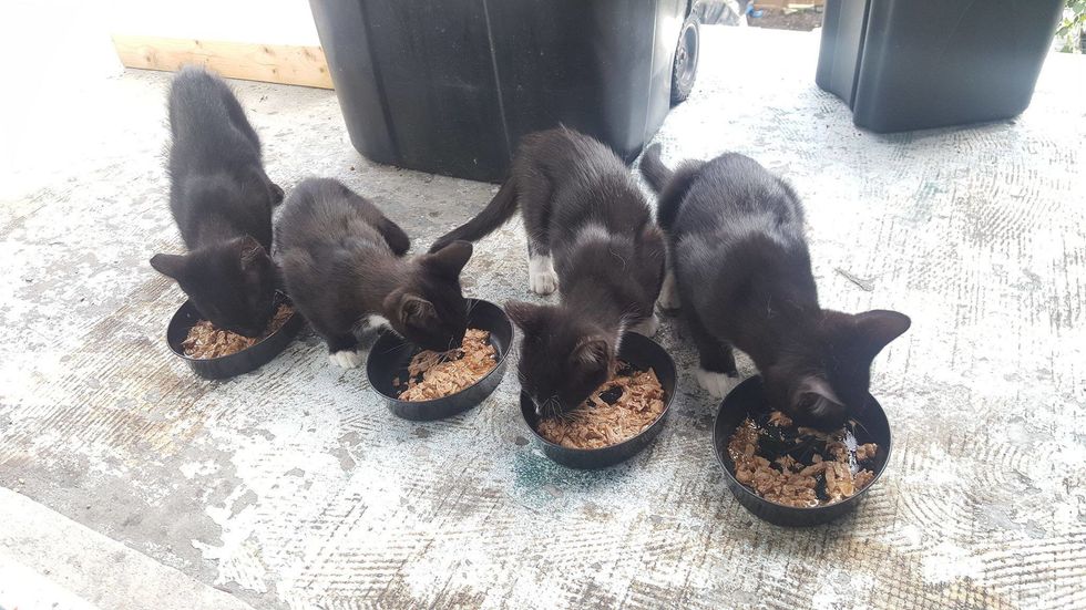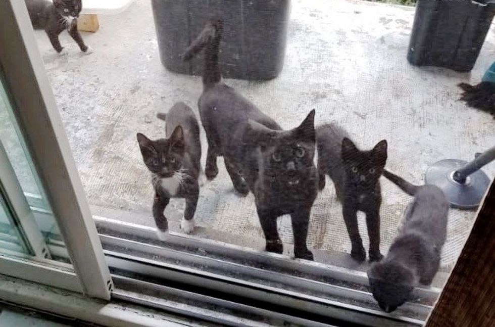 Earlier this year, an elusive black cat showed up on their porch for a share of the food. When she returned later, she didn't come alone — she brought her entire family with her.