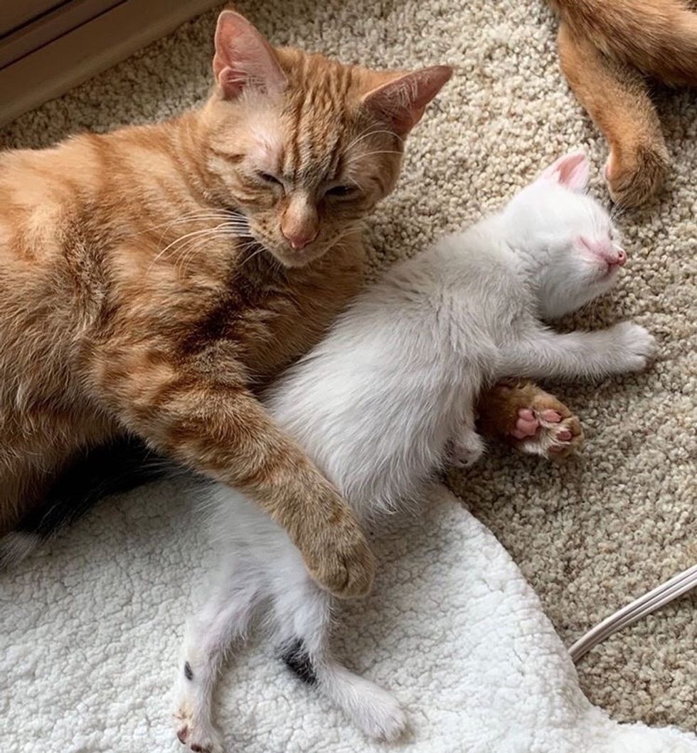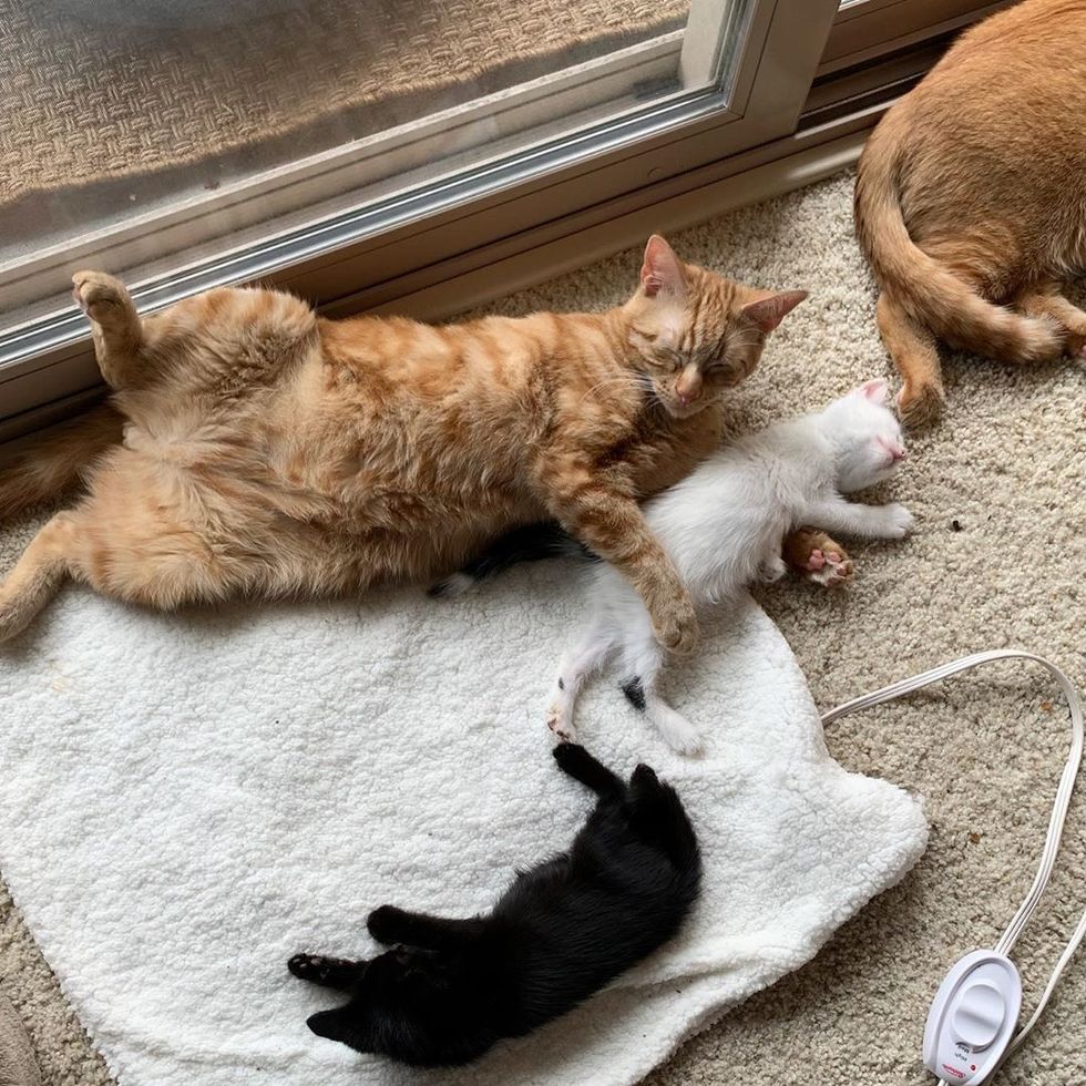 The ginger boys have taken the young kittens under their wing. They cuddle with them when they nap, keep them clean and teach them how to be a cat.