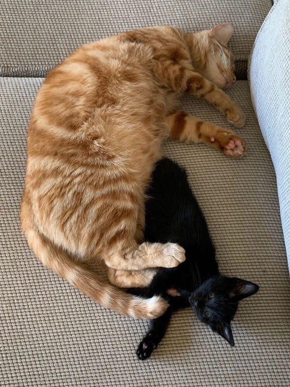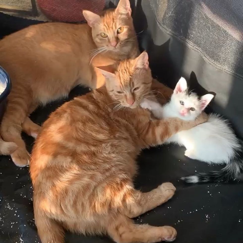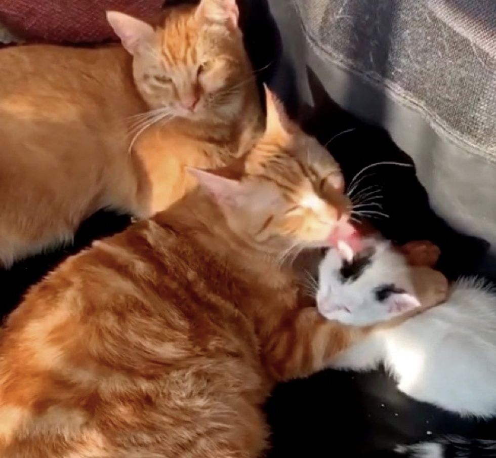 Two ginger brothers who had been in foster care for months, met two tinier kittens. They immediately bonded.