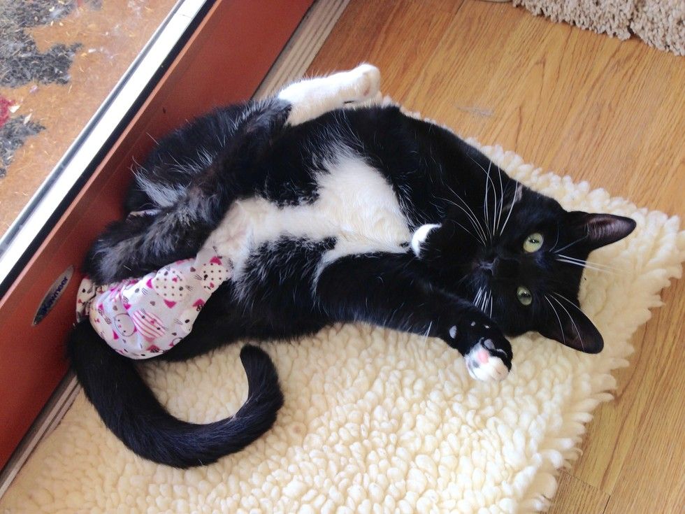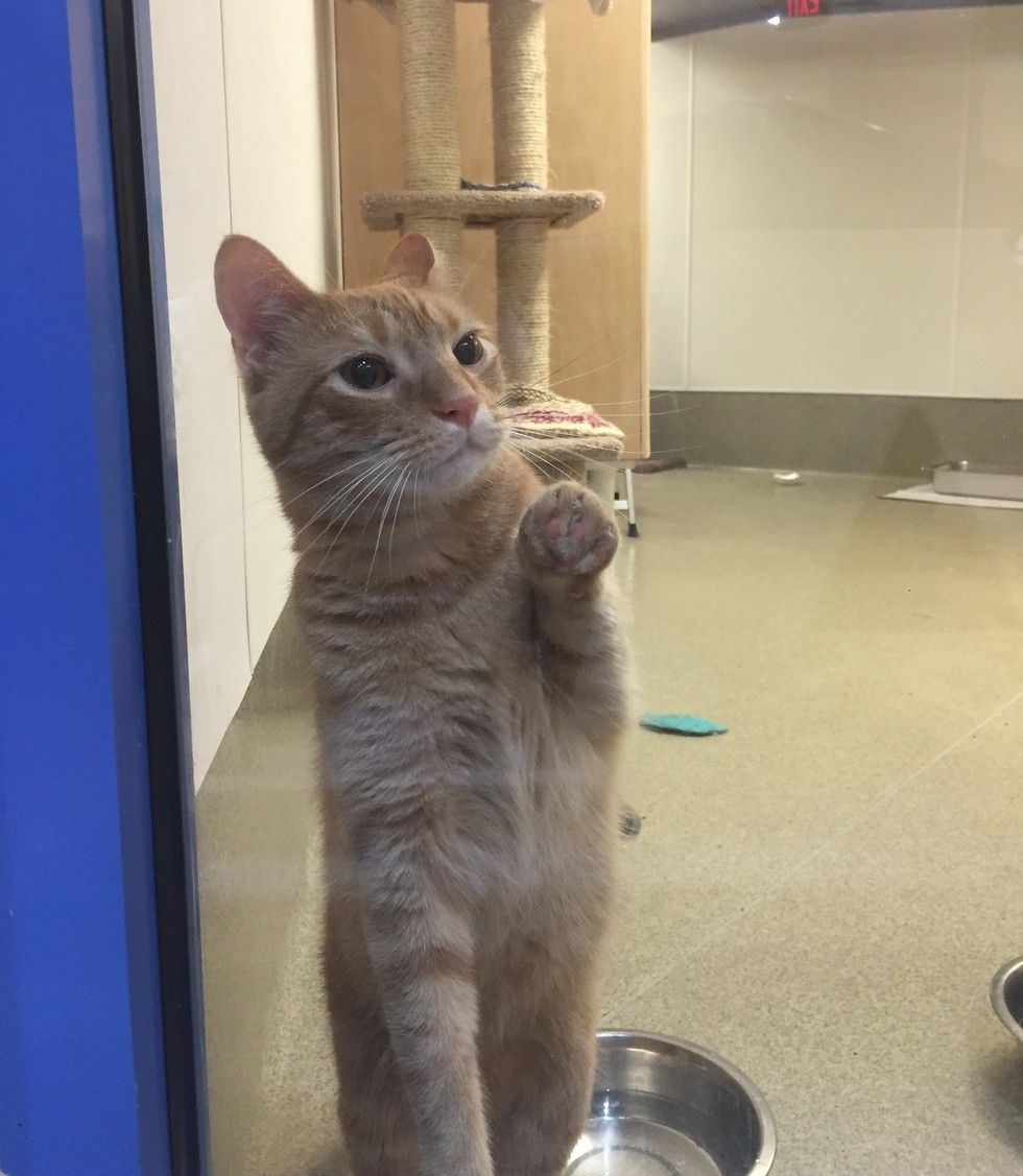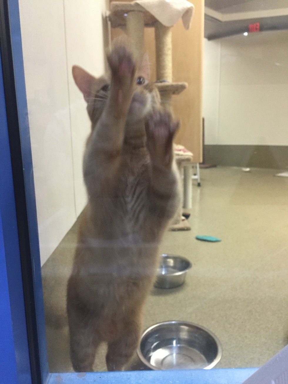 Their resident cat, Olive the paraplegic kitty, comes over and tries to play with him while he is waiting by the window.