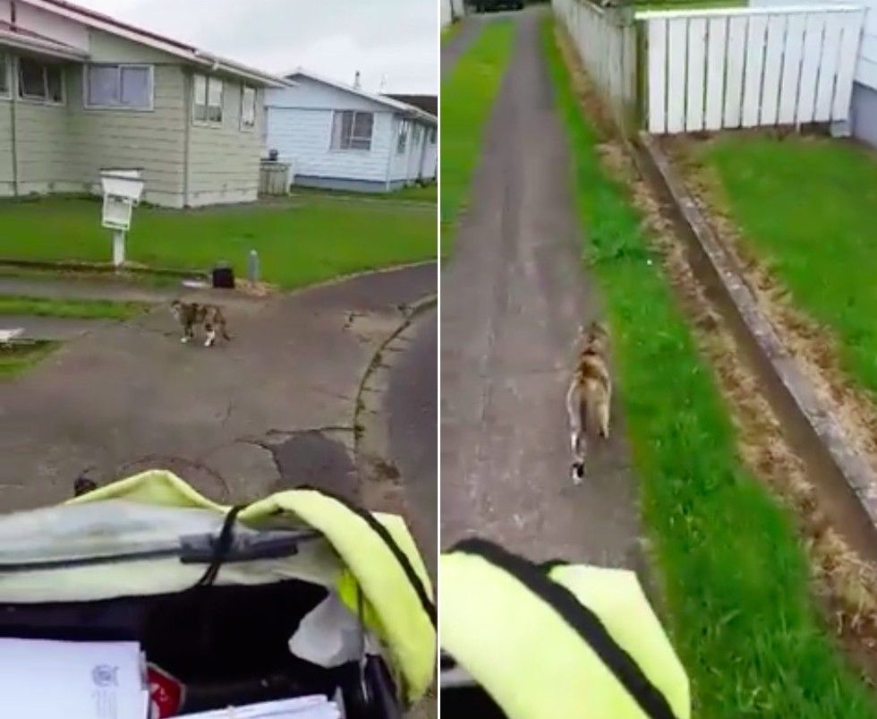 A postman, Levi Davis, from New Zealand Post enjoys his daily mail run in this particular area in the town of Taranaki because a little furry friend comes to see him every day, regardless of the weather.