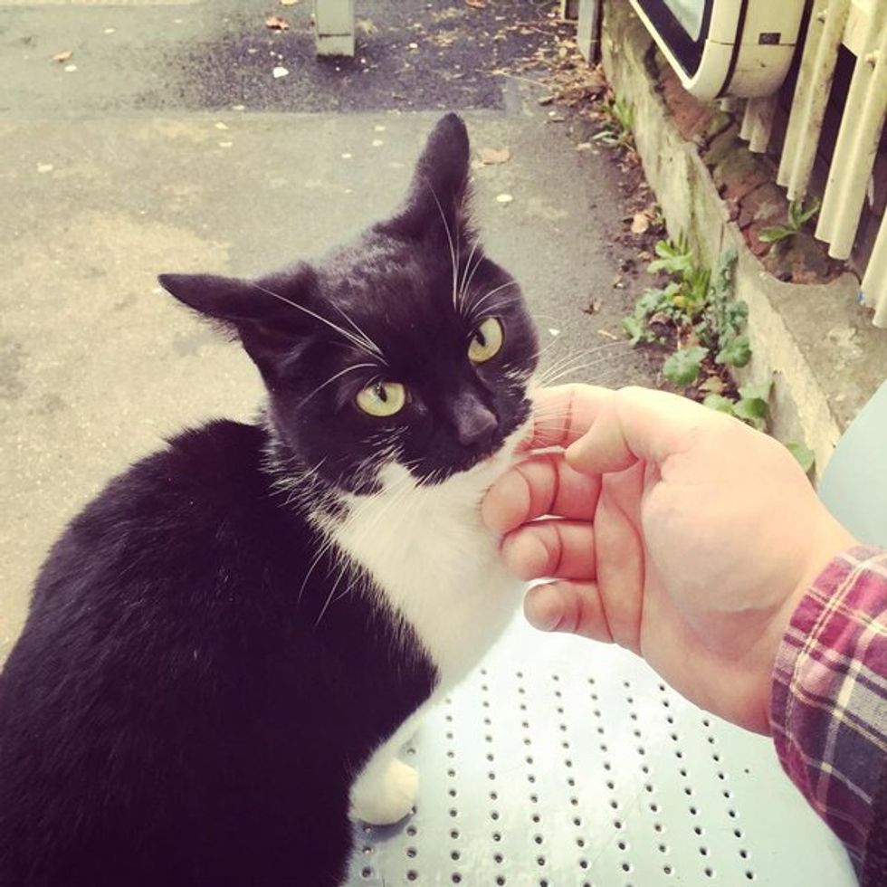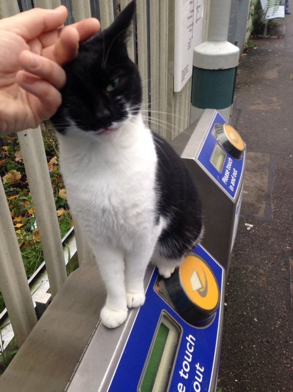 This batcat looking tuxedo loves nothing more than getting all the love and attention from the local passengers. She purrs up a storm for the morning commuters and leaves them with a wonderful smile to take them through the rest of the day.