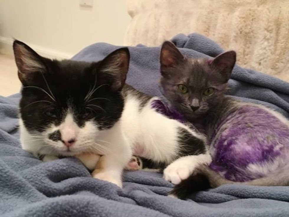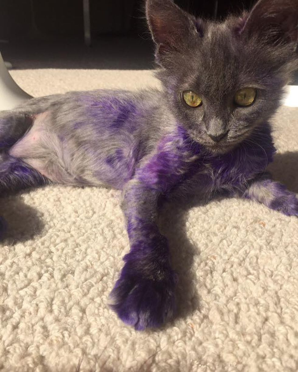 His coat was dyed with purple ink. The staff at the Nine Lives Foundation did everything they could to remove the dye, but some tough stains stuck to his fur. They weren't sure if the little kitten could pull through this battle, but they continued to fight for his survival.