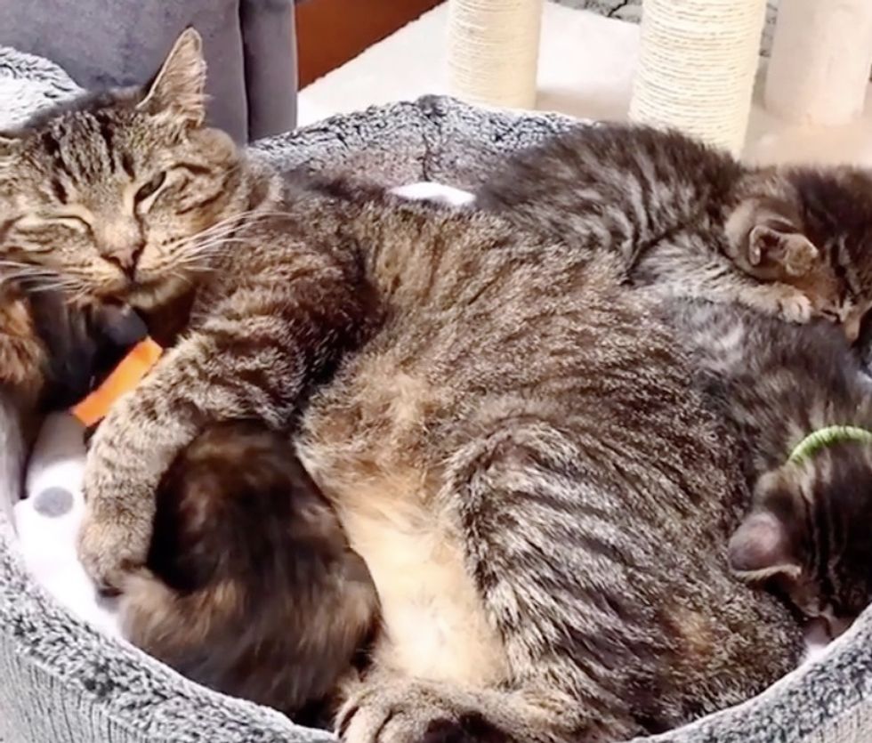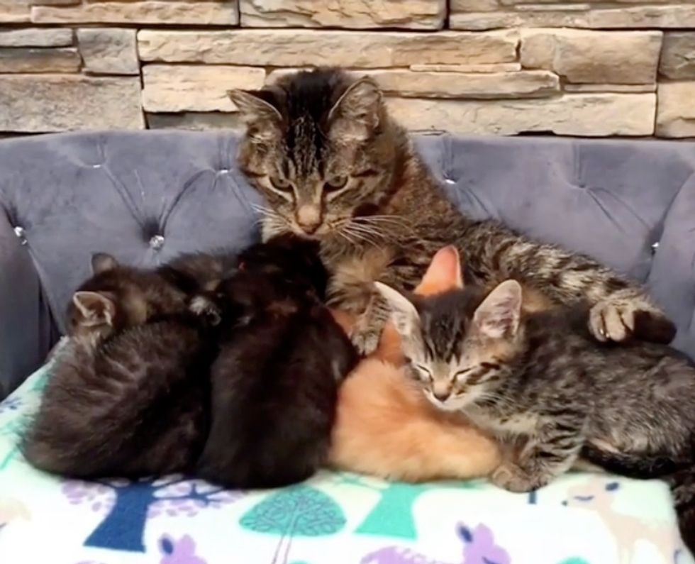 When they return to their babies, sweet Mason gives them space to reunite with their kittens but is always ready to cuddle and play whenever the kittens need him.