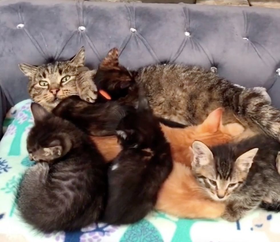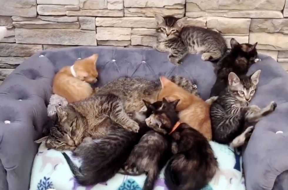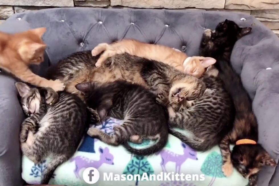 The little couch is back to how it used to be - full of foster kittens. "Grandpa Mason and his kittens are enjoying a good old-fashioned kitten pile on the tiny sofa," the rescue said.