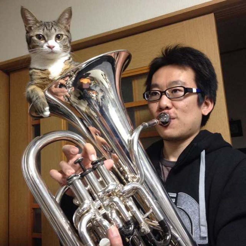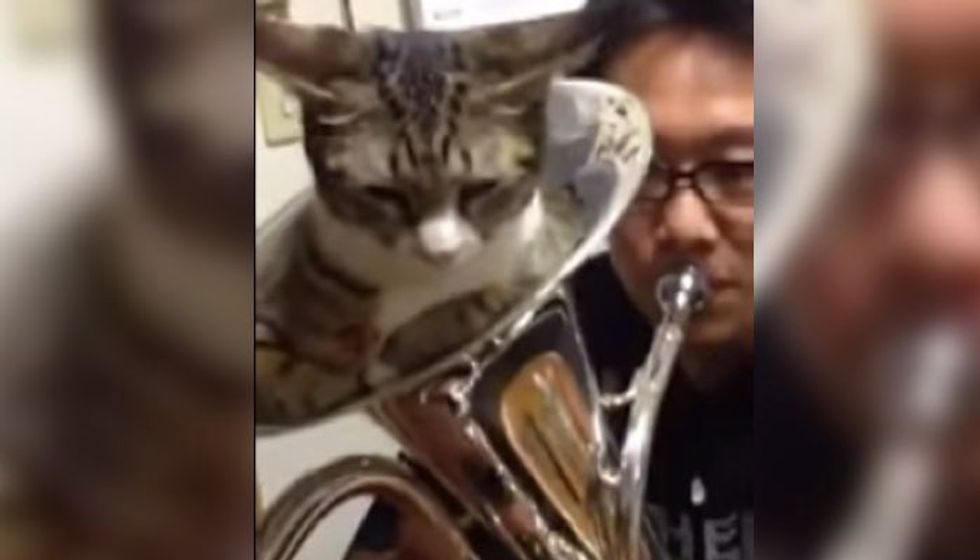 This kitty decides to chill in his human's Euphonium and becomes the mute for his brass instrument. Kazuhiro's cat is quite fascinated by the shape of the instrument and goes in there to see if it'd fit. Turns out it's a purrfect fit!
